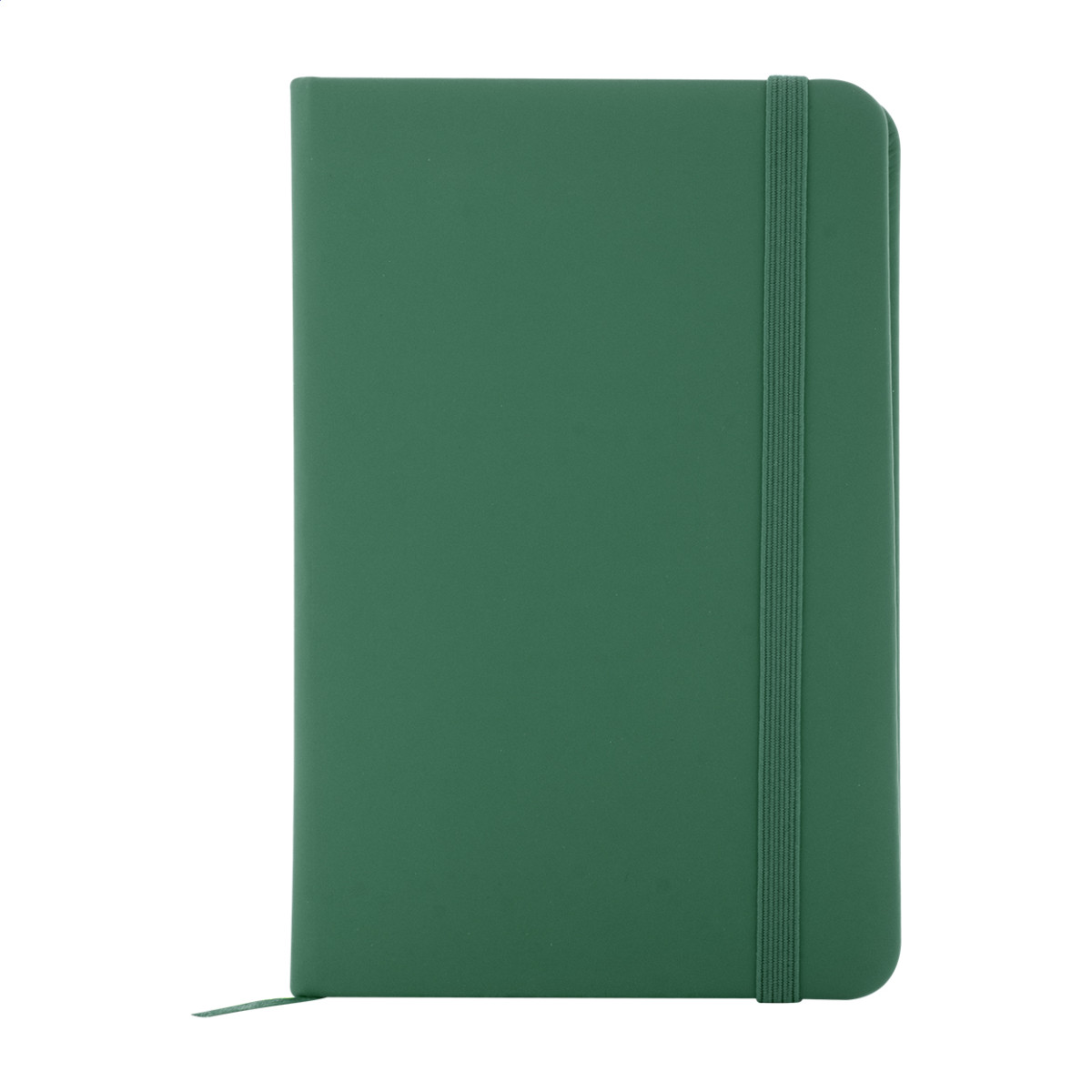 Úrahasznosított PU bőr borítású jegyzetfüzet újrahasznosított papírból készült 100 sima lappal. Hozzáillő színű gumipánttal és könyvjelzővel. A6 méretű. Eleje