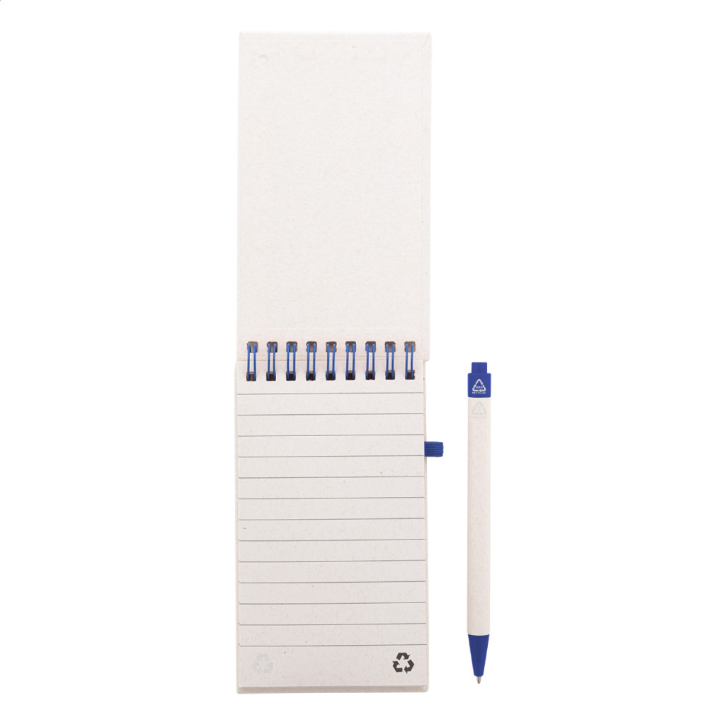 Újrahasznosított tejesdoboz anyagú spirálfüzet kemény borítóval és 70 vonalas lappal. Hozzáillő színű spirálgyűrűkkel, gumipánttal és tolltartóval. Újrahasznosított tejesdoboz és újrahasznosított ABS műanyag golyóstollal, kék tollbetéttel. A6 méretű. Eleje