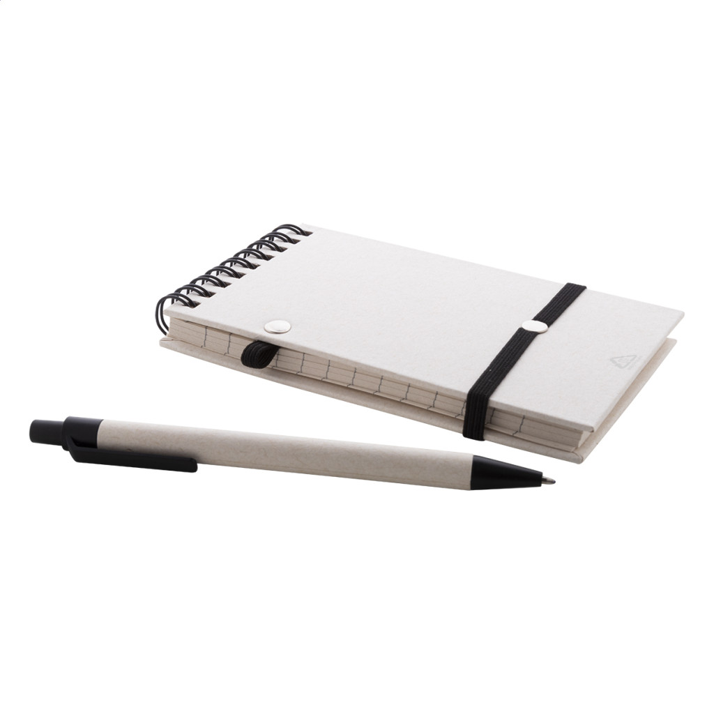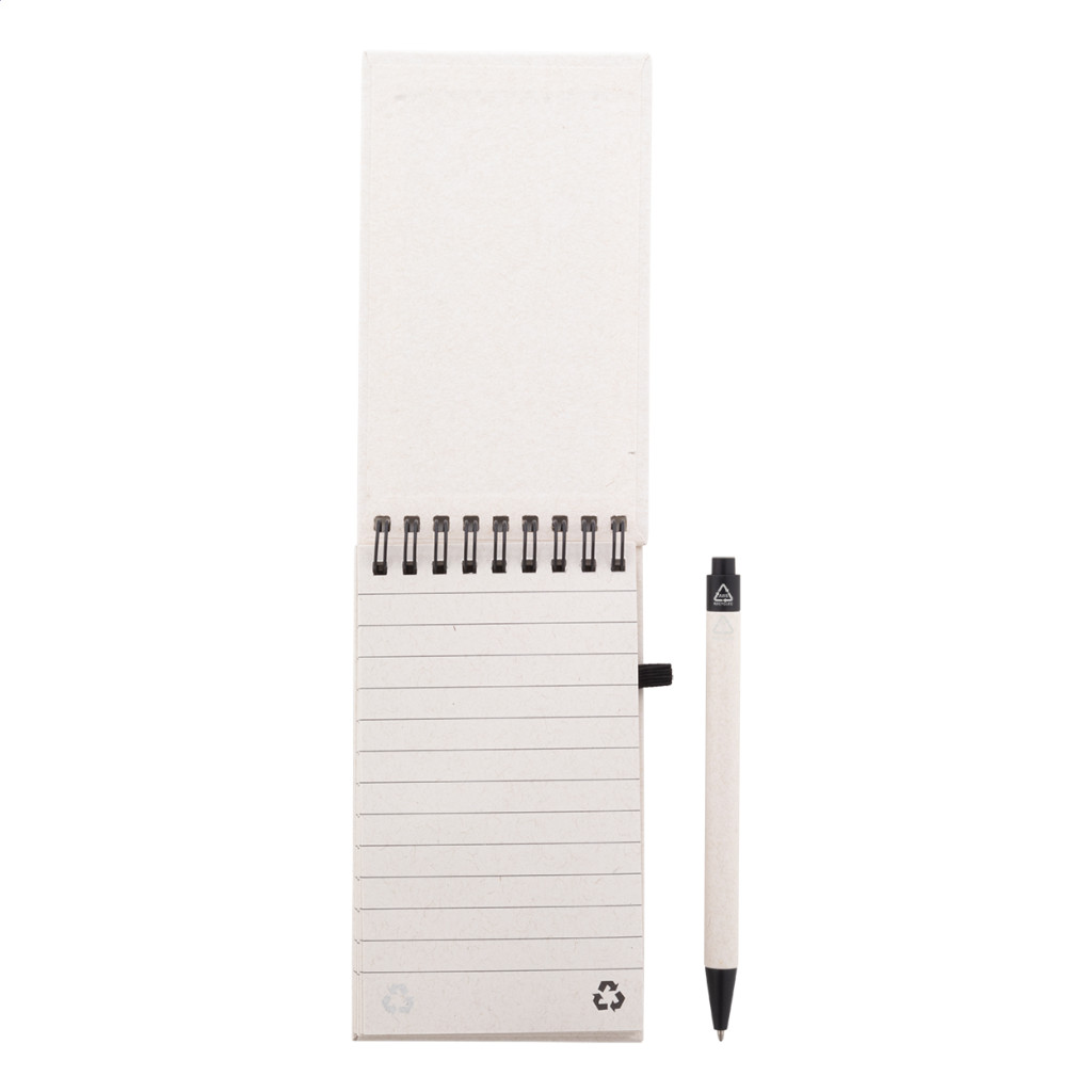 Újrahasznosított tejesdoboz anyagú spirálfüzet kemény borítóval és 70 vonalas lappal. Hozzáillő színű spirálgyűrűkkel, gumipánttal és tolltartóval. Újrahasznosított tejesdoboz és újrahasznosított ABS műanyag golyóstollal, kék tollbetéttel. A6 méretű. Eleje