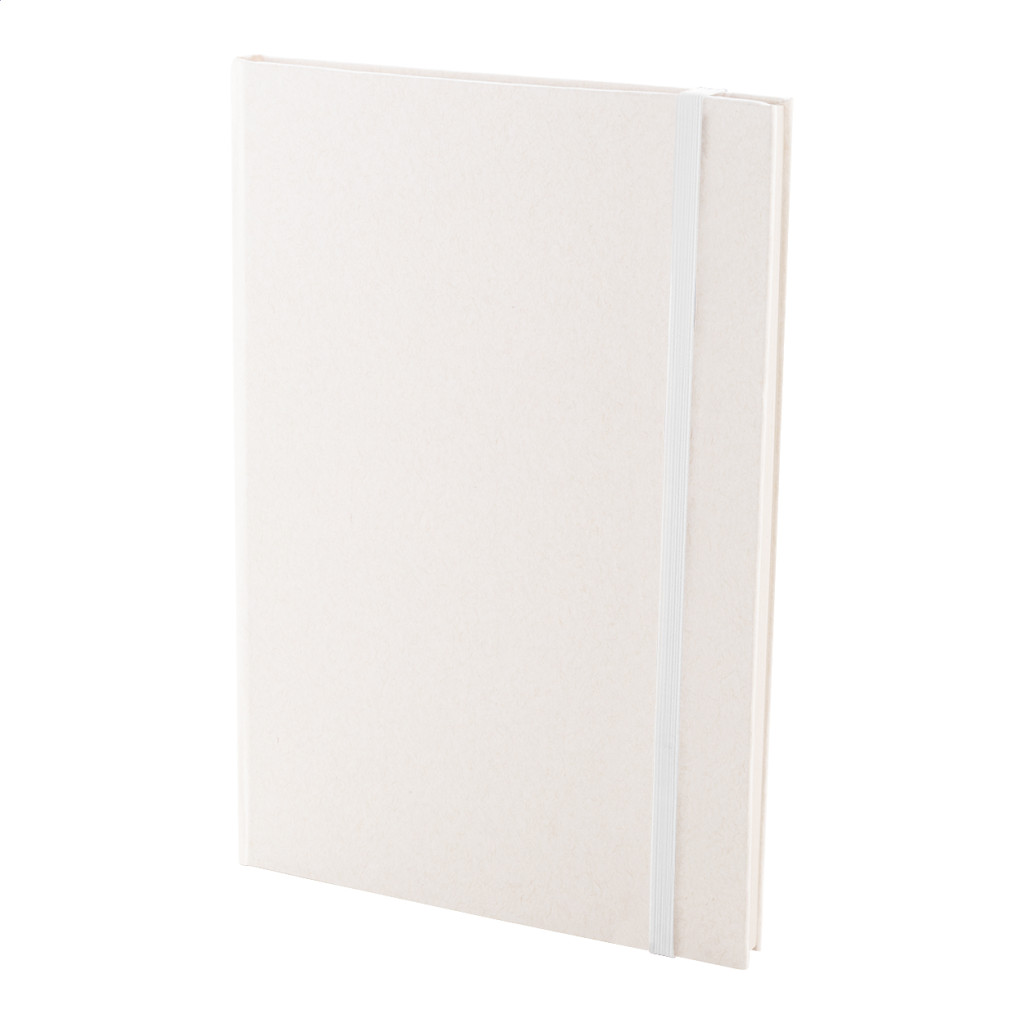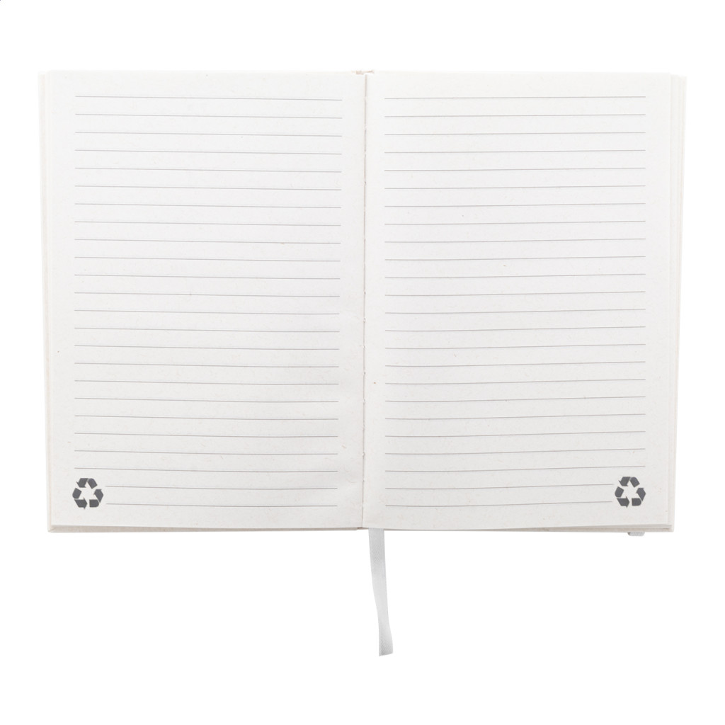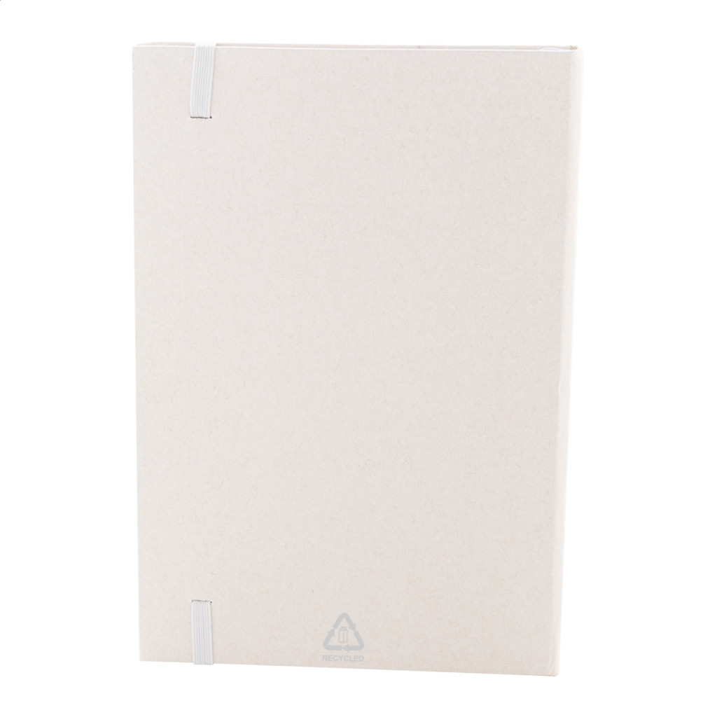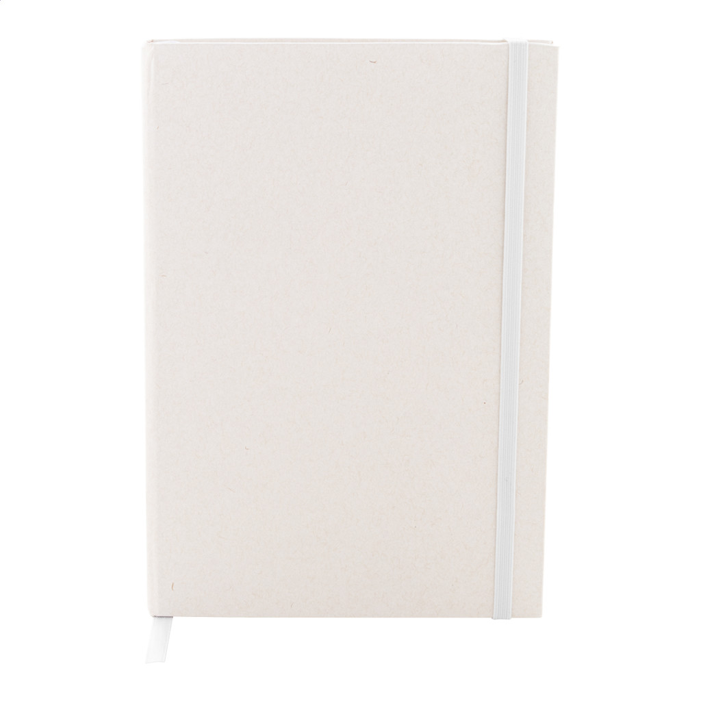 Újrahasznosított tejesdoboz anyagú jegyzetfüzet kemény borítóval és 80 vonalas lappal. Hozzáillő színű gumiszalaggal. A5 méretű. Eleje