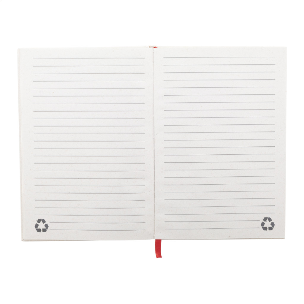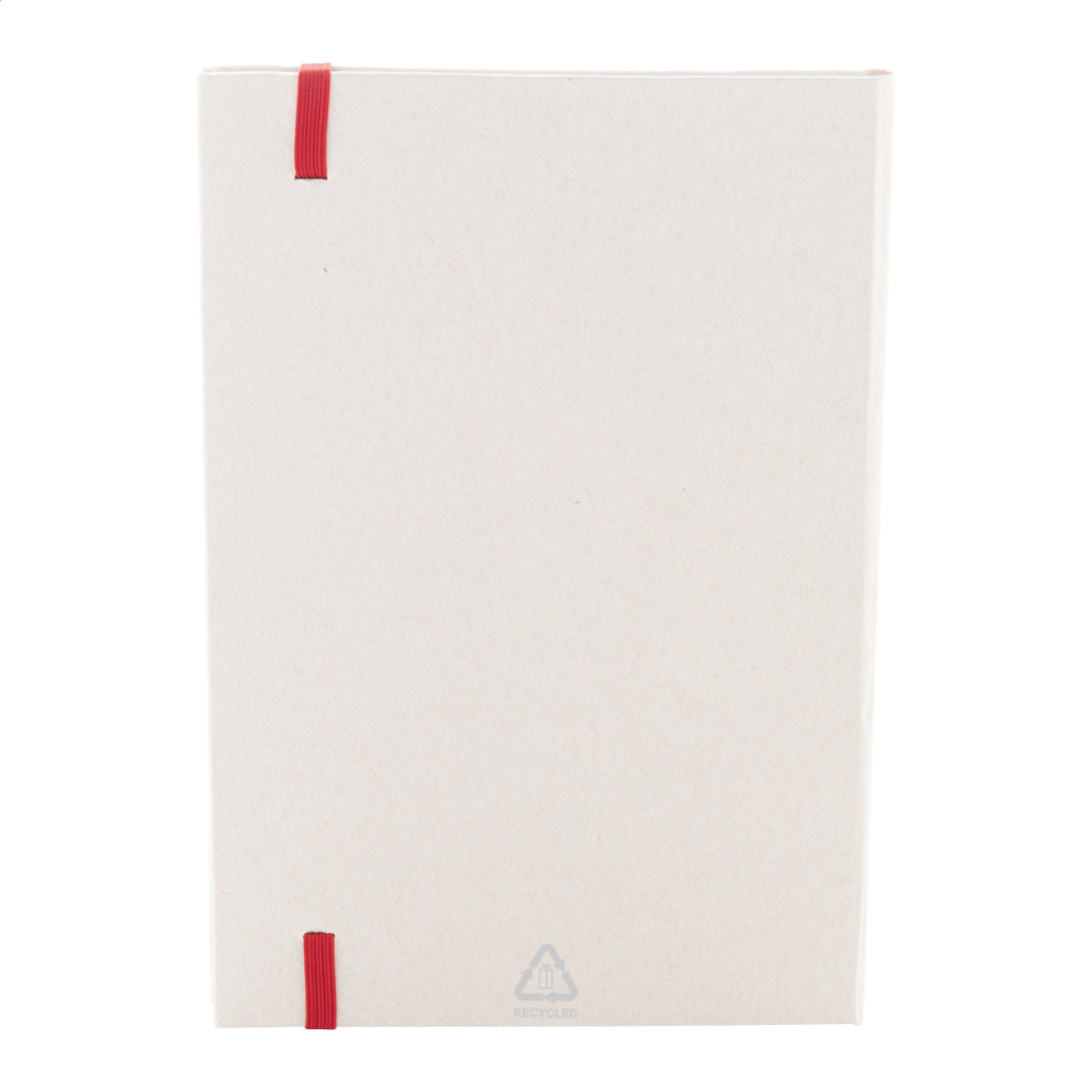 Újrahasznosított tejesdoboz anyagú jegyzetfüzet kemény borítóval és 80 vonalas lappal. Hozzáillő színű gumiszalaggal. A5 méretű. Eleje