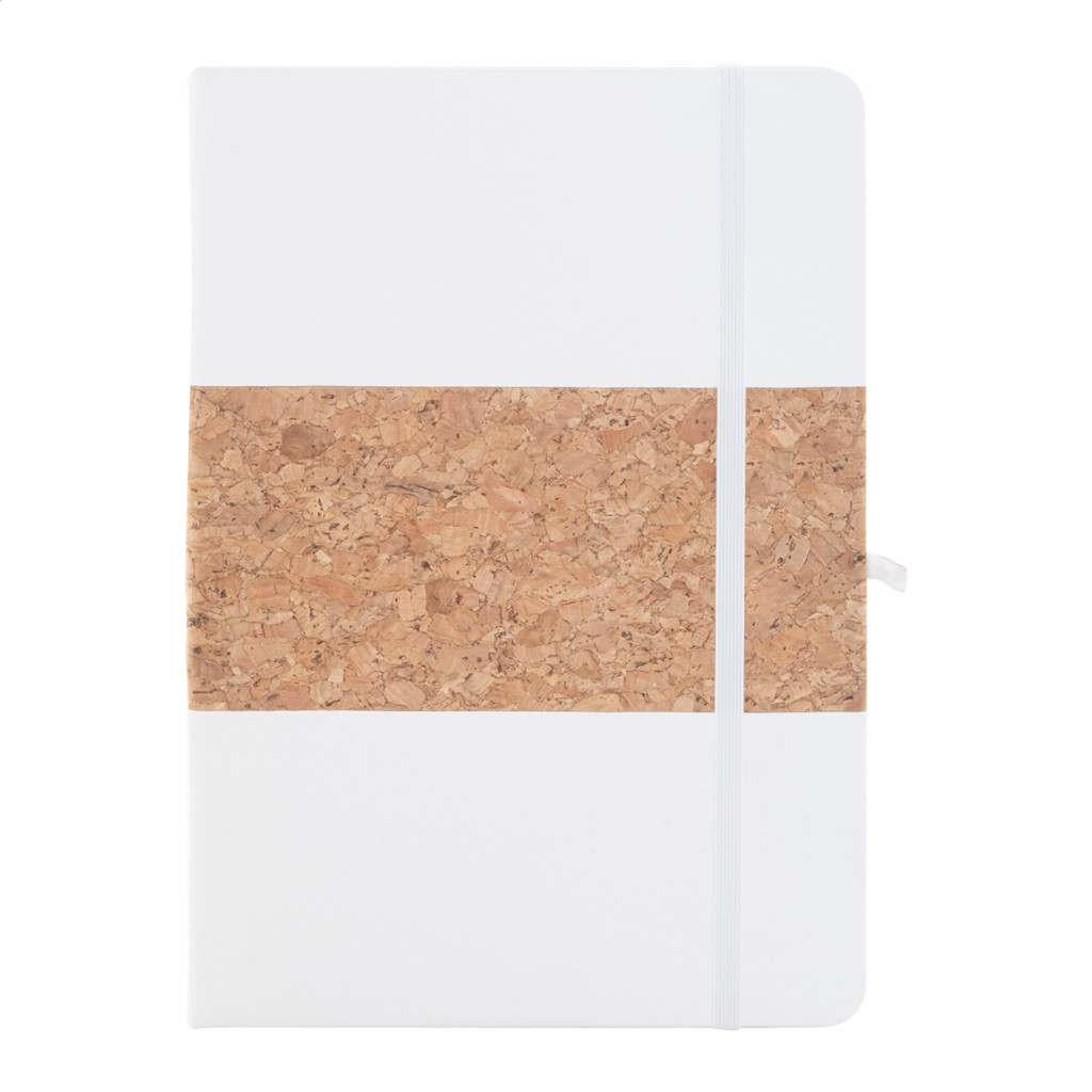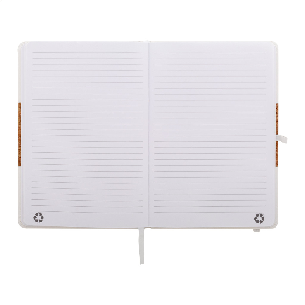 Természetes parafa és újrahasznosított PU bőr borítású jegyzetfüzet hozzáillő színű könyvjelzővel, gumiszalaggal és tolltartóval. 80 vonalas lappal, újrahasznosított papírból. A5 méretű. Eleje - teteje