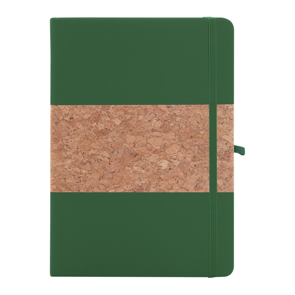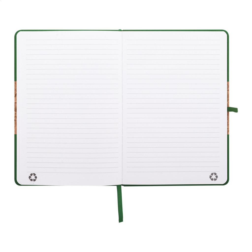Természetes parafa és újrahasznosított PU bőr borítású jegyzetfüzet hozzáillő színű könyvjelzővel, gumiszalaggal és tolltartóval. 80 vonalas lappal, újrahasznosított papírból. A5 méretű. Eleje - teteje
