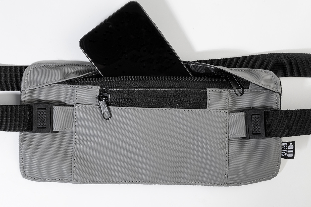 Keskeny RPET övtáska PU bevonatú elülső oldallal, cipzáras rekesszel és elülső zsebbel, állítható pánttal. PU bevonatú 600D RPET poliészterből, megkülönböztető RPET címkével. |