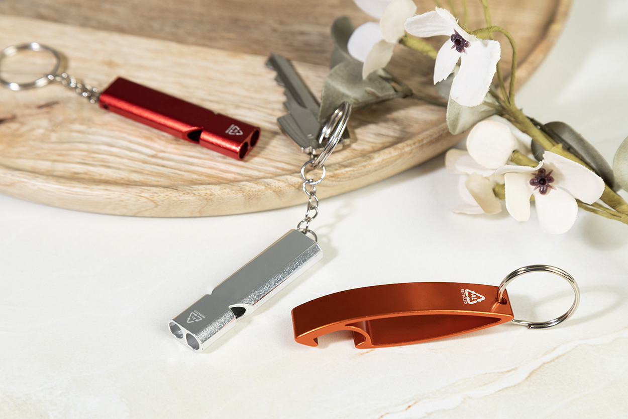Újrahasznosított alumínium üvegnyitó fém kulcskarikával. Teteje