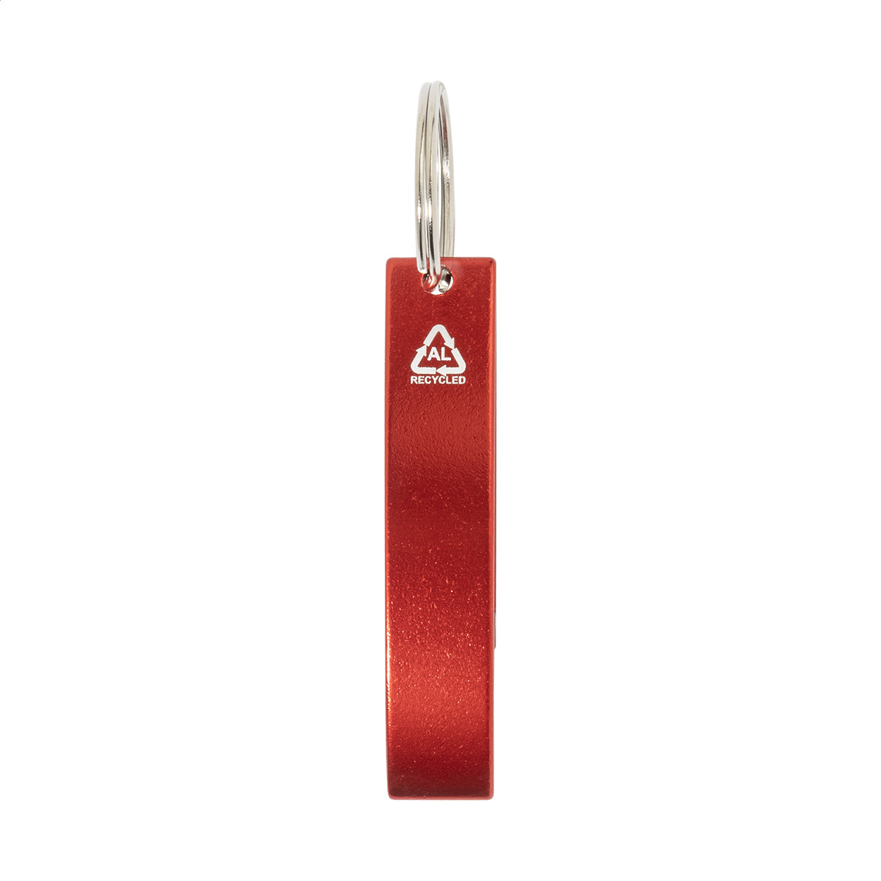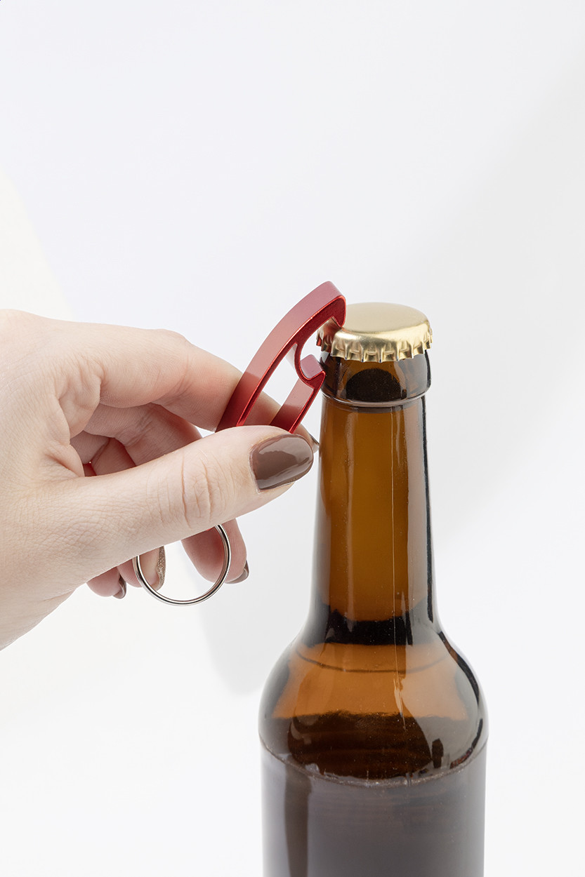 Újrahasznosított alumínium üvegnyitó fém kulcskarikával. Teteje