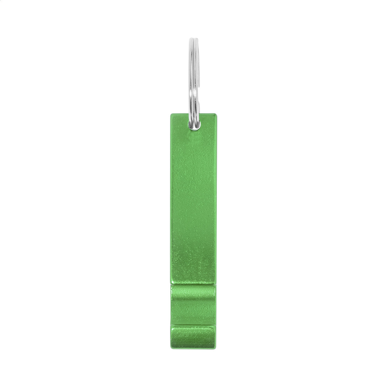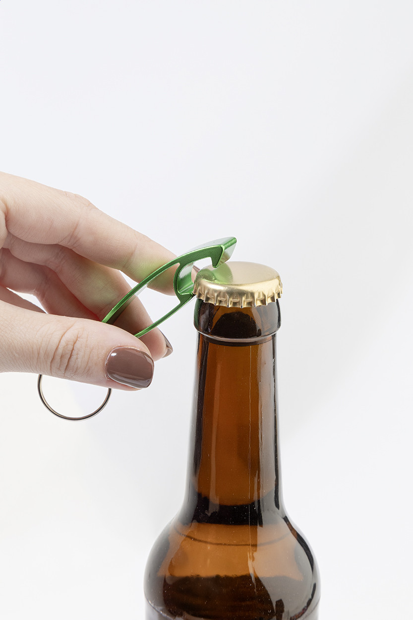 Újrahasznosított alumínium üvegnyitó fém kulcskarikával. Teteje