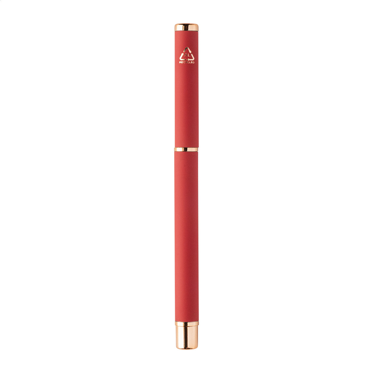 Újrahasznosított alumínium tollszett golyóstollal és rollertollal, gumírozott felülettel és rózsaarany részletekkel. Kék tollbetéttel. Speciális bevonattal a tükörlézeres gravírozáshoz rózsaarany színben. Fekete papír ajándékdobozban. Golyóstoll klipsz alatt - jobbkezes