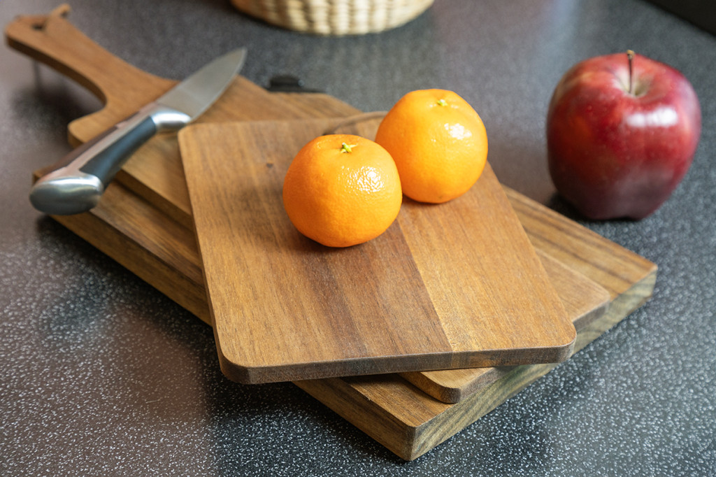 Akácfából készült vágó- és tálalódeszka fogantyúval és PU bőr zsinórral. Eleje