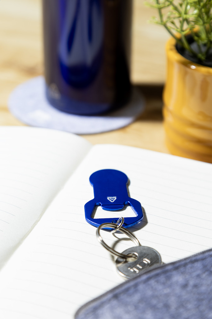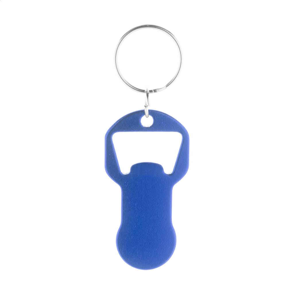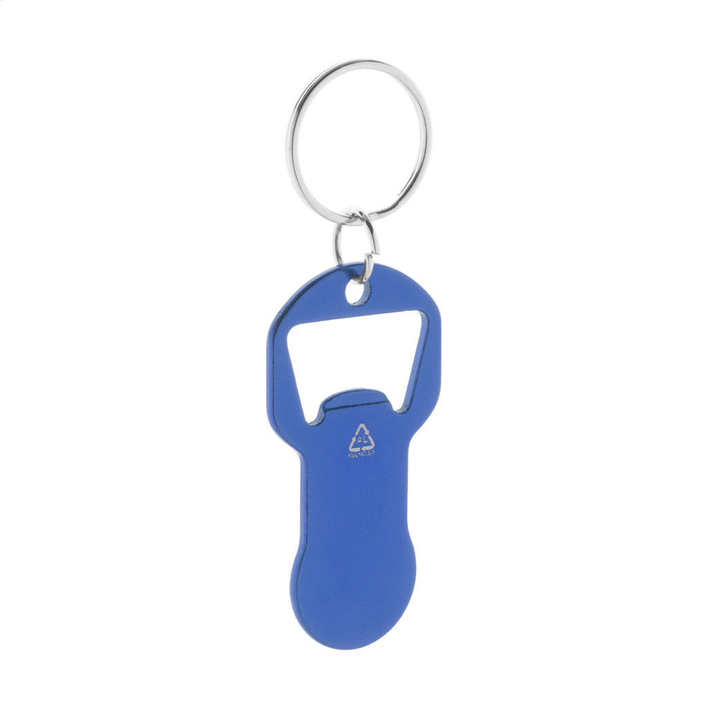 Újrahasznosított alumínium üvegnyitós kulcstartó bevásárlókocsi érmével. Eleje