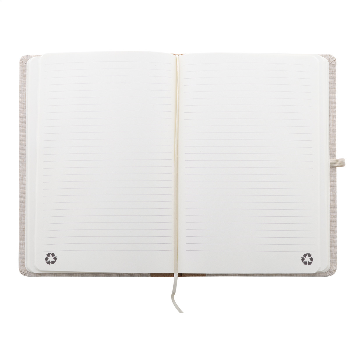 RPET poliészter borítású jegyzetfüzet natúr parafa gerinccel és 80 vonalas lappal, újrahasznosított papírból. Könyvjelzővel, gumipánttal és tolltartóval. A5 méretű. Eleje