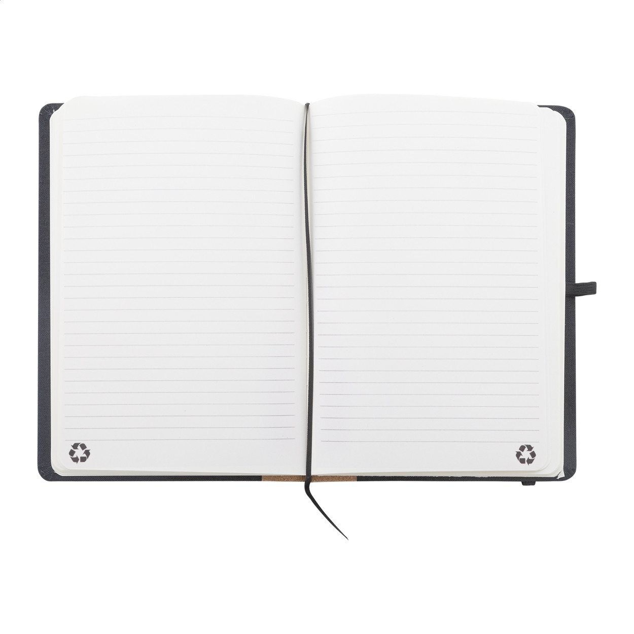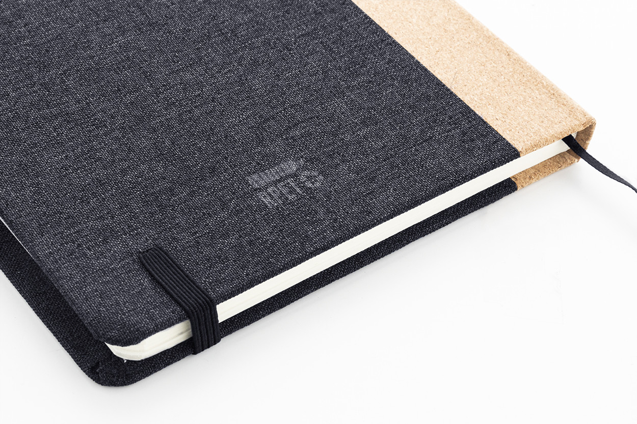 RPET poliészter borítású jegyzetfüzet natúr parafa gerinccel és 80 vonalas lappal, újrahasznosított papírból. Könyvjelzővel, gumipánttal és tolltartóval. A5 méretű. Eleje