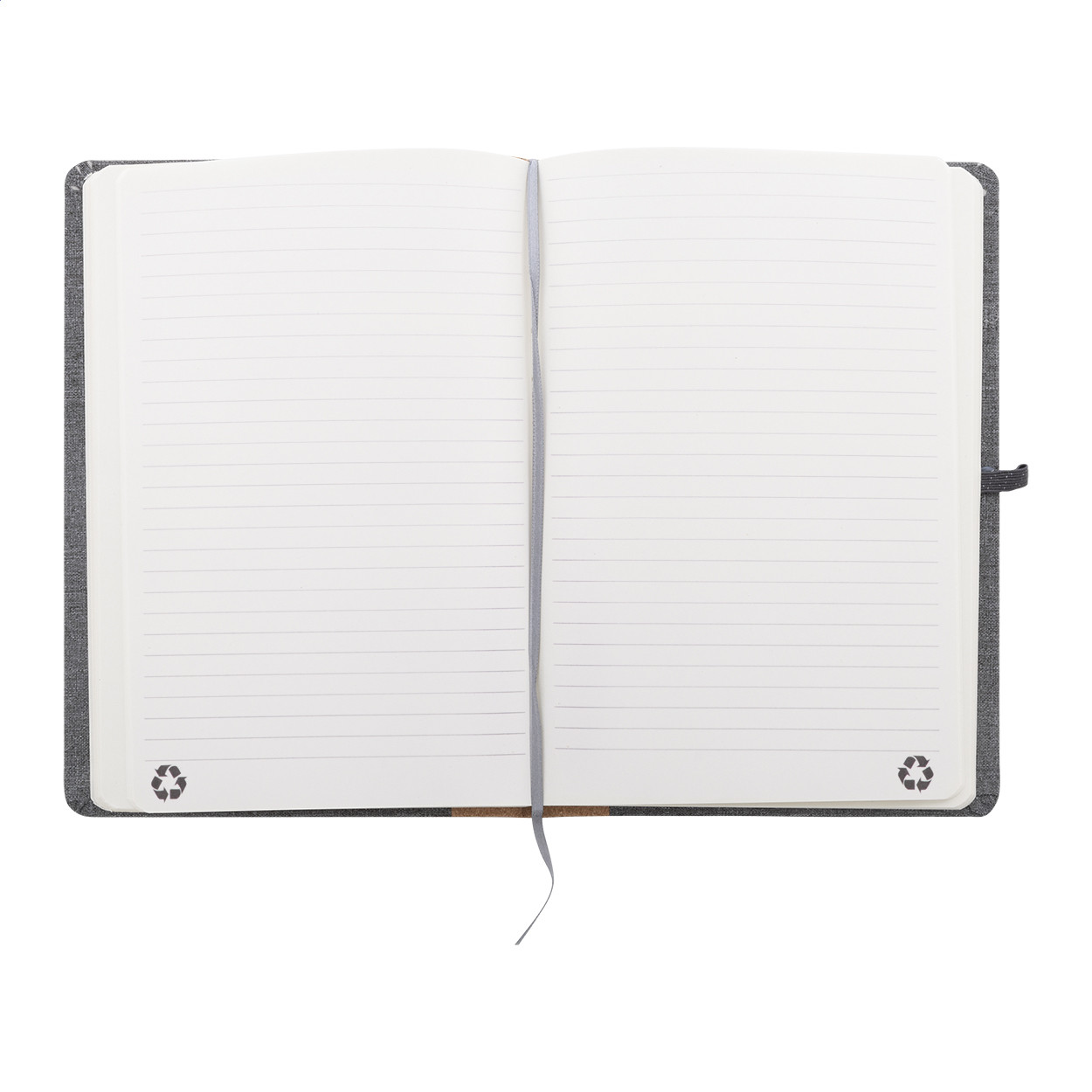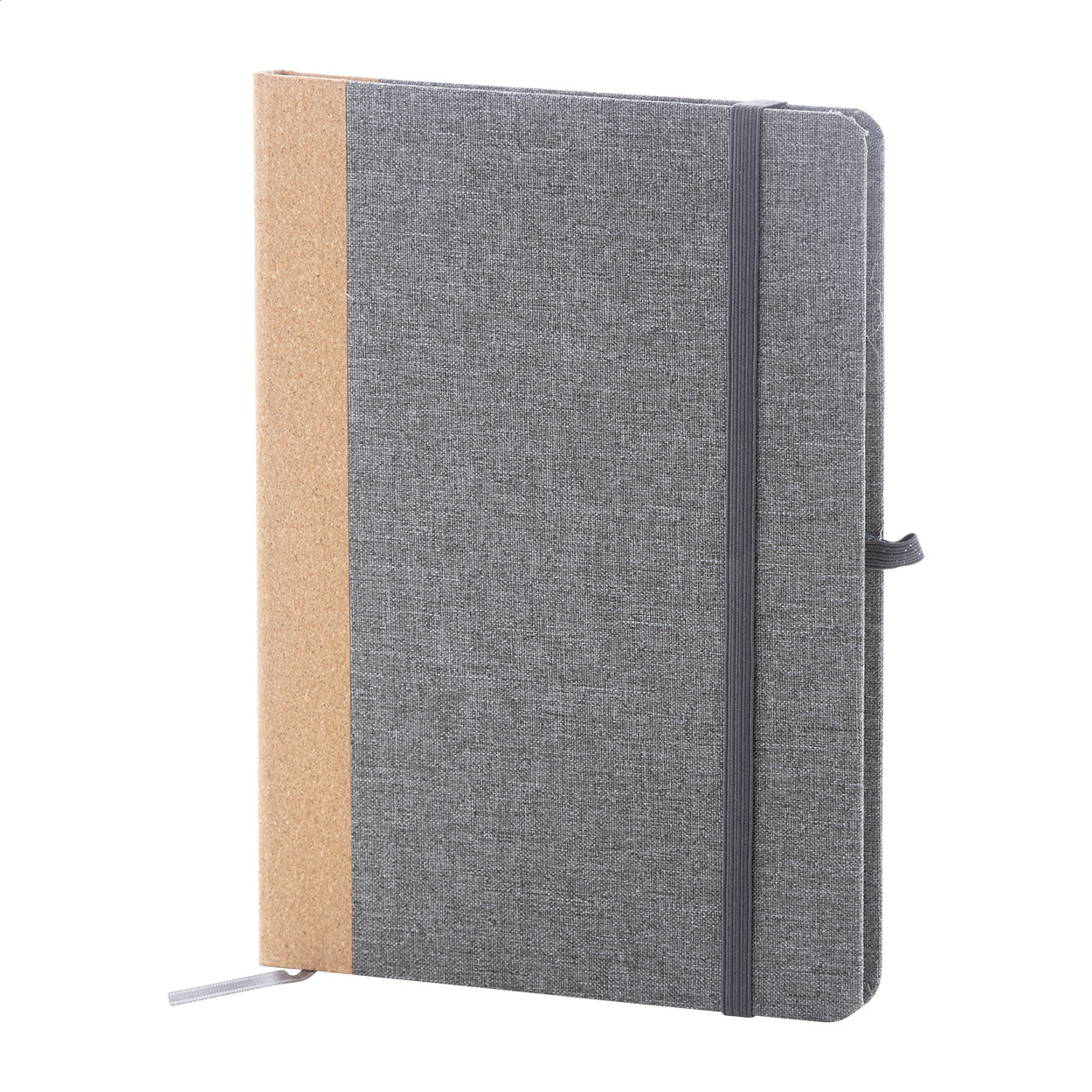 RPET poliészter borítású jegyzetfüzet natúr parafa gerinccel és 80 vonalas lappal, újrahasznosított papírból. Könyvjelzővel, gumipánttal és tolltartóval. A5 méretű. Eleje