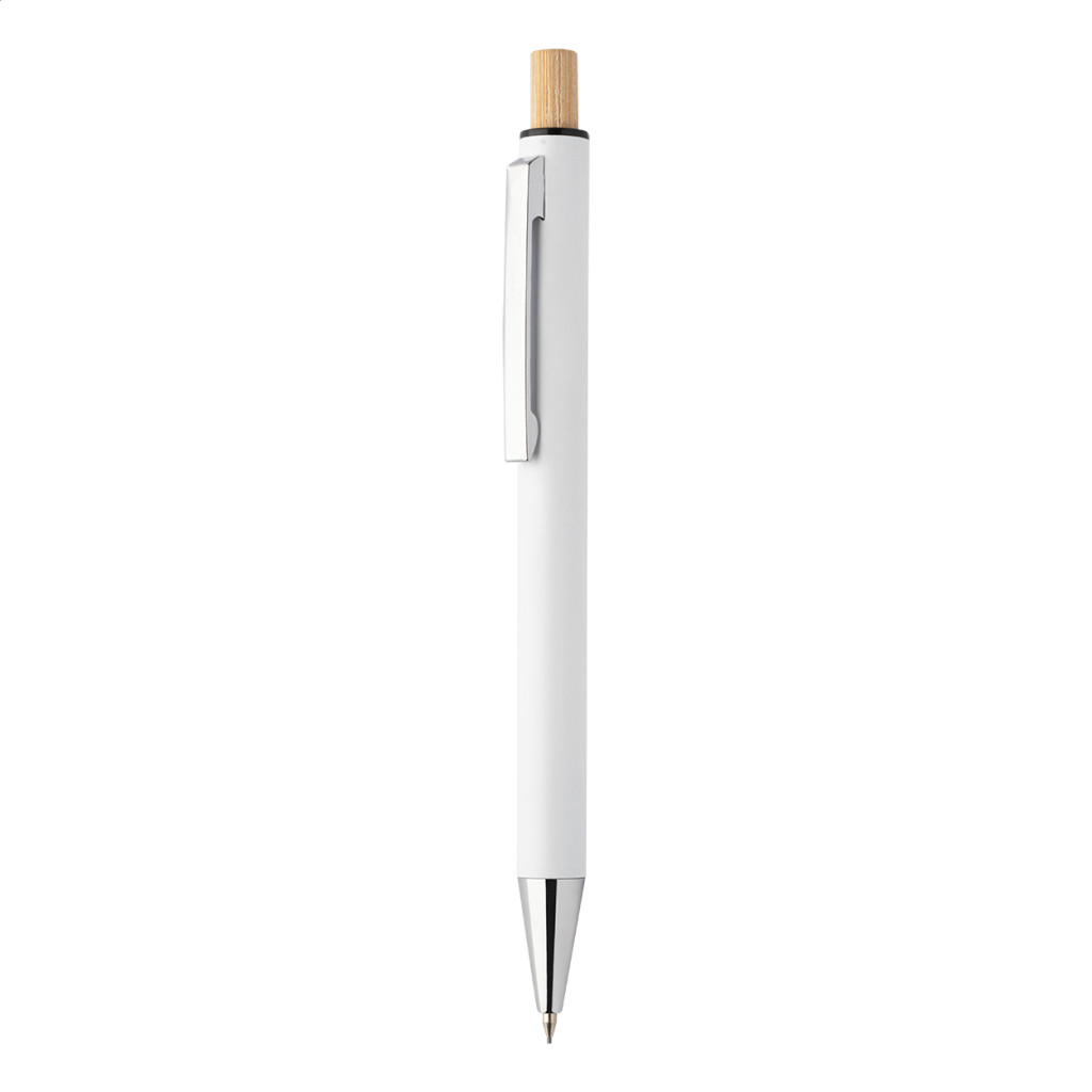 Újrahasznosított alumínium tollszett golyóstollal és töltőceruzával, bambusz gombokkal. Kék tollbetéttel és 0,7 mm-es heggyel. Kraft papír dobozban. Golyóstoll test - jobbkezes