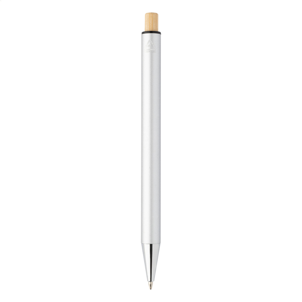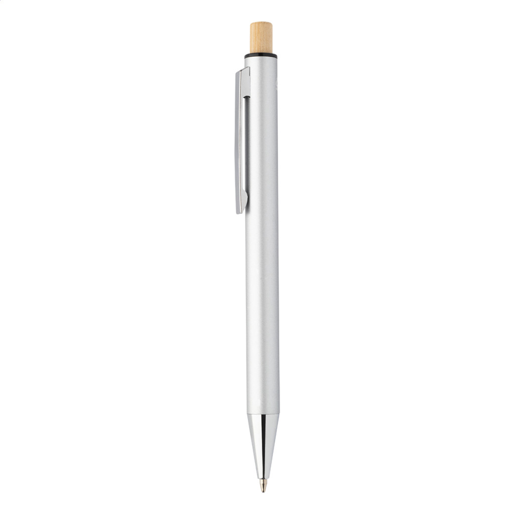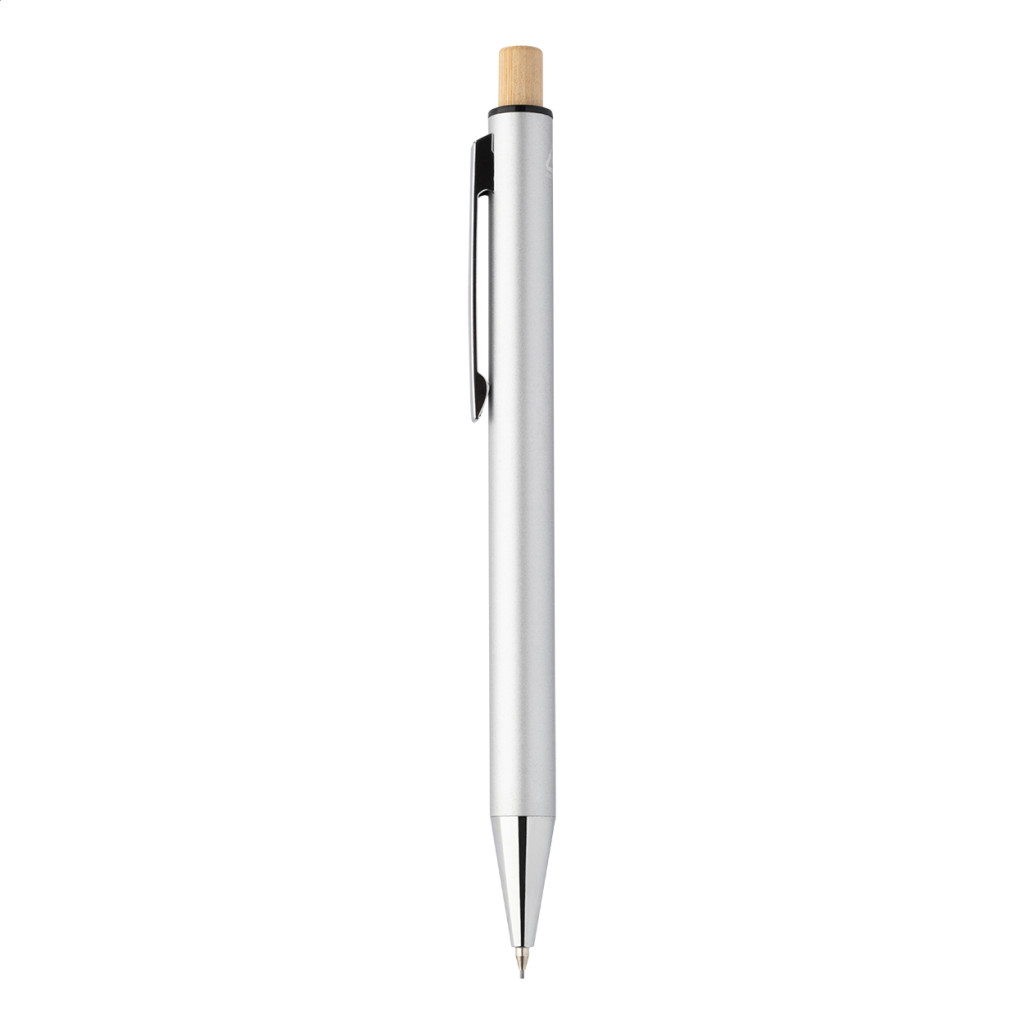 Újrahasznosított alumínium tollszett golyóstollal és töltőceruzával, bambusz gombokkal. Kék tollbetéttel és 0,7 mm-es heggyel. Kraft papír dobozban. Golyóstoll test - jobbkezes