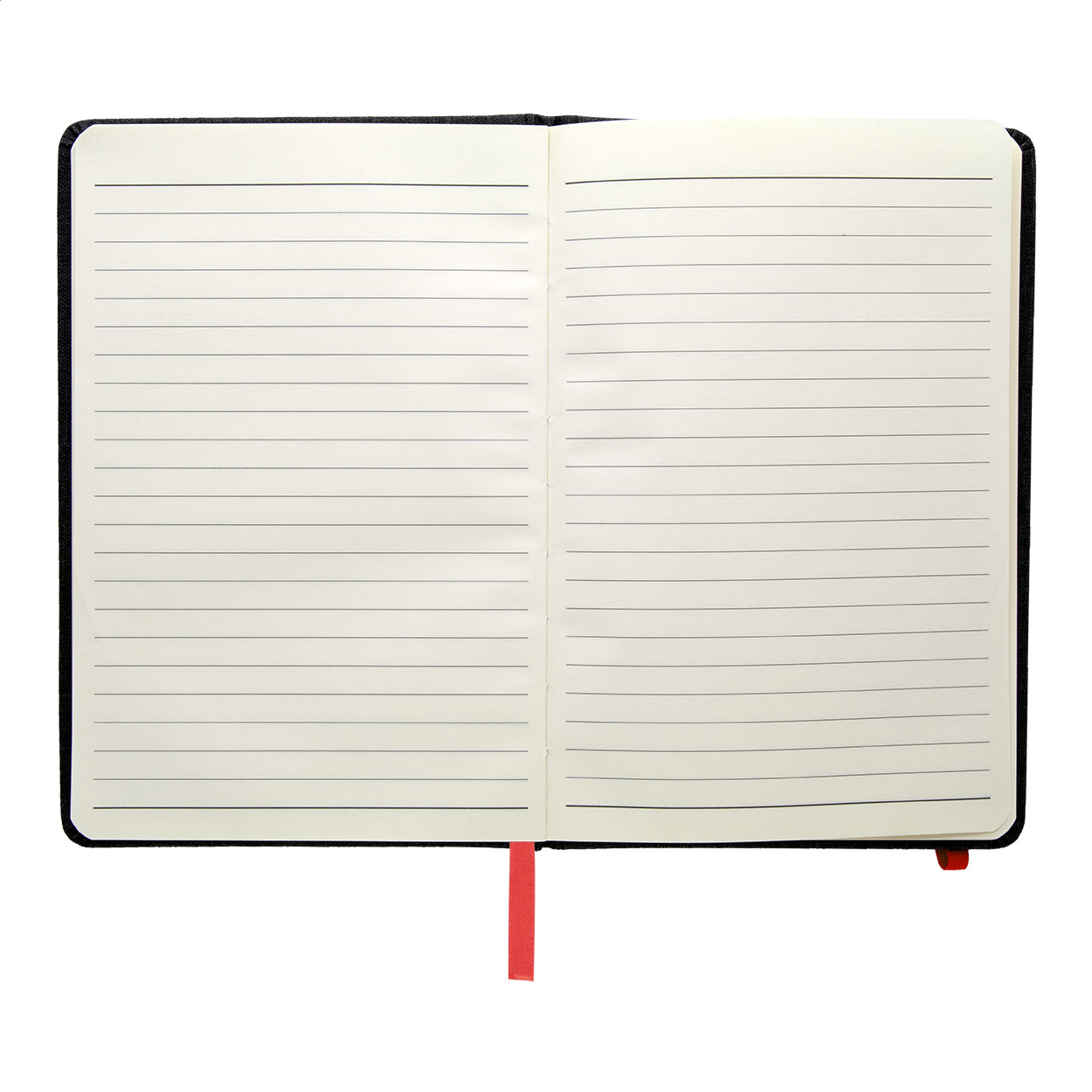 PU bőrrel borított jegyzetfüzet megegyező színű könyvjelzővel, gumiszalaggal és tolltartóval. 96 vonalas lappal, A5 méret. Eleje