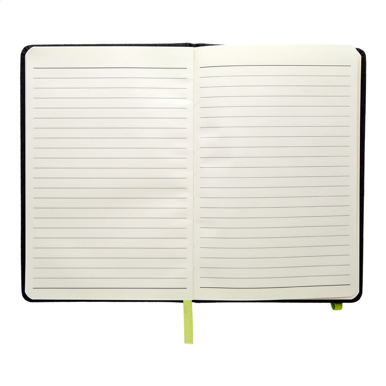 PU bőrrel borított jegyzetfüzet megegyező színű könyvjelzővel, gumiszalaggal és tolltartóval. 96 vonalas lappal, A5 méret. Eleje