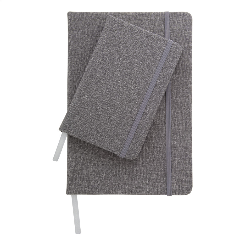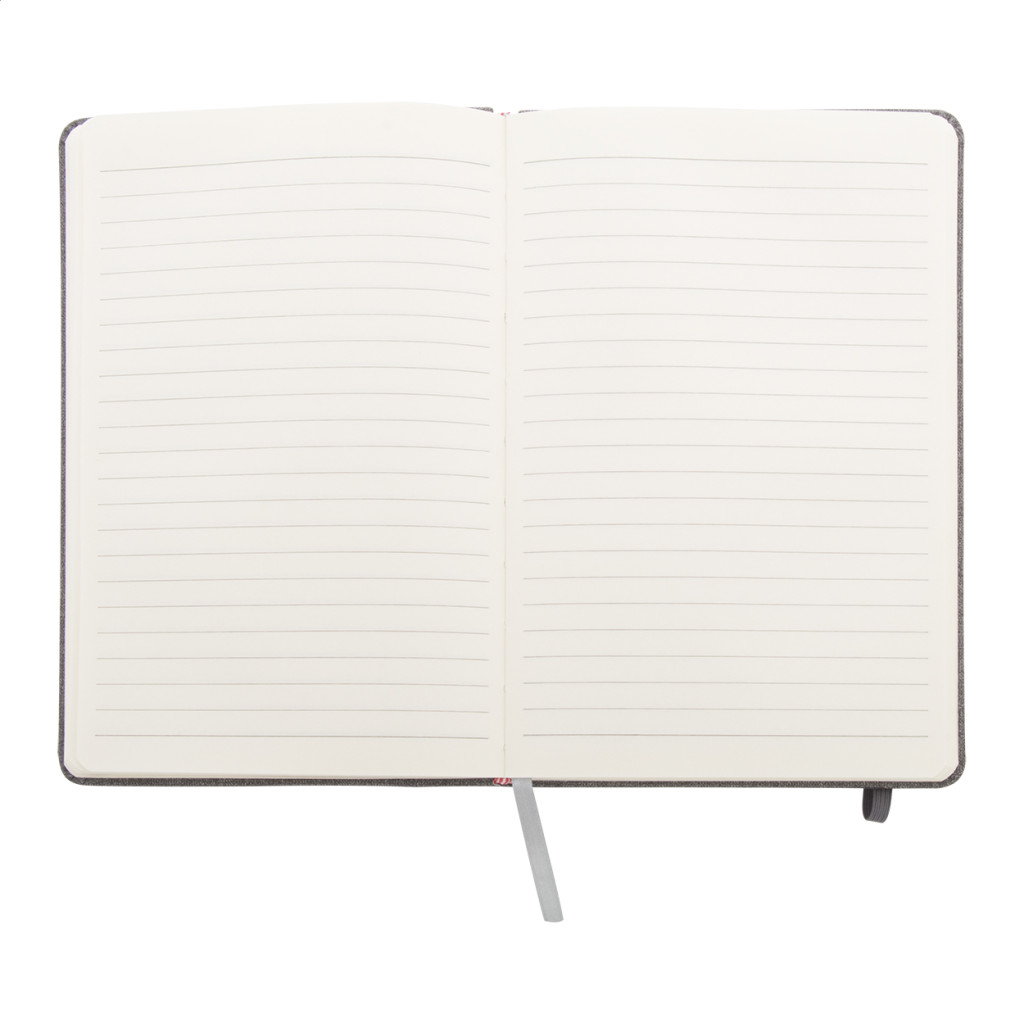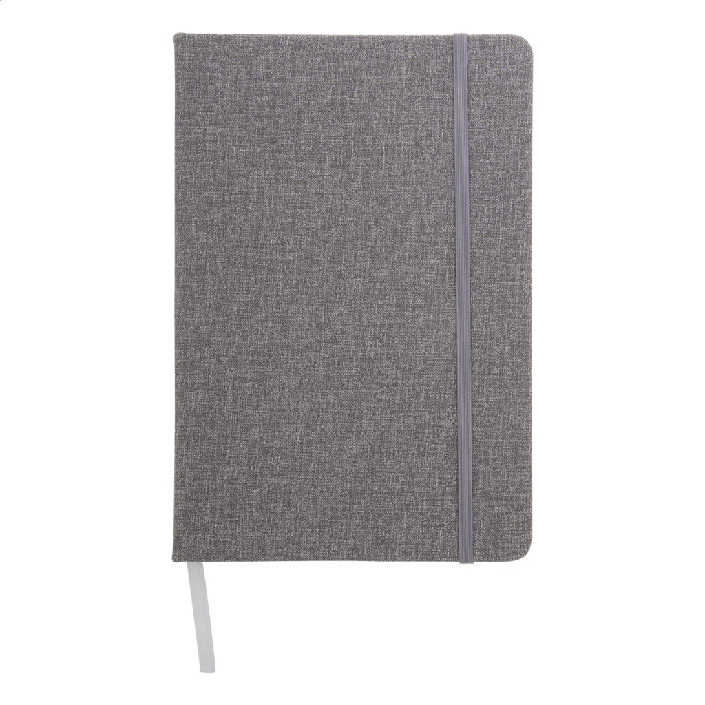 PU bőr borítású textil hatású jegyzetfüzet 80 vonalas lappal, gumipánttal zárható. A5 méretű. Eleje