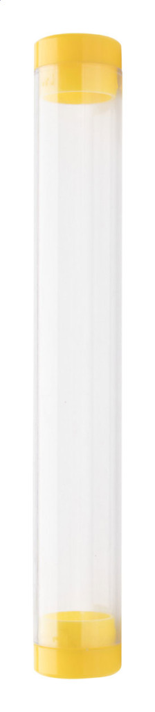 Átlátszó műanyag, henger alakú tolltartó, színes zárókupakokkal. Eleje