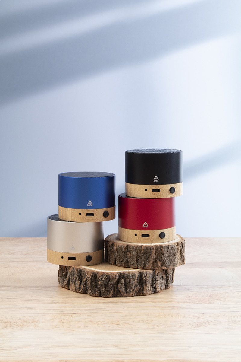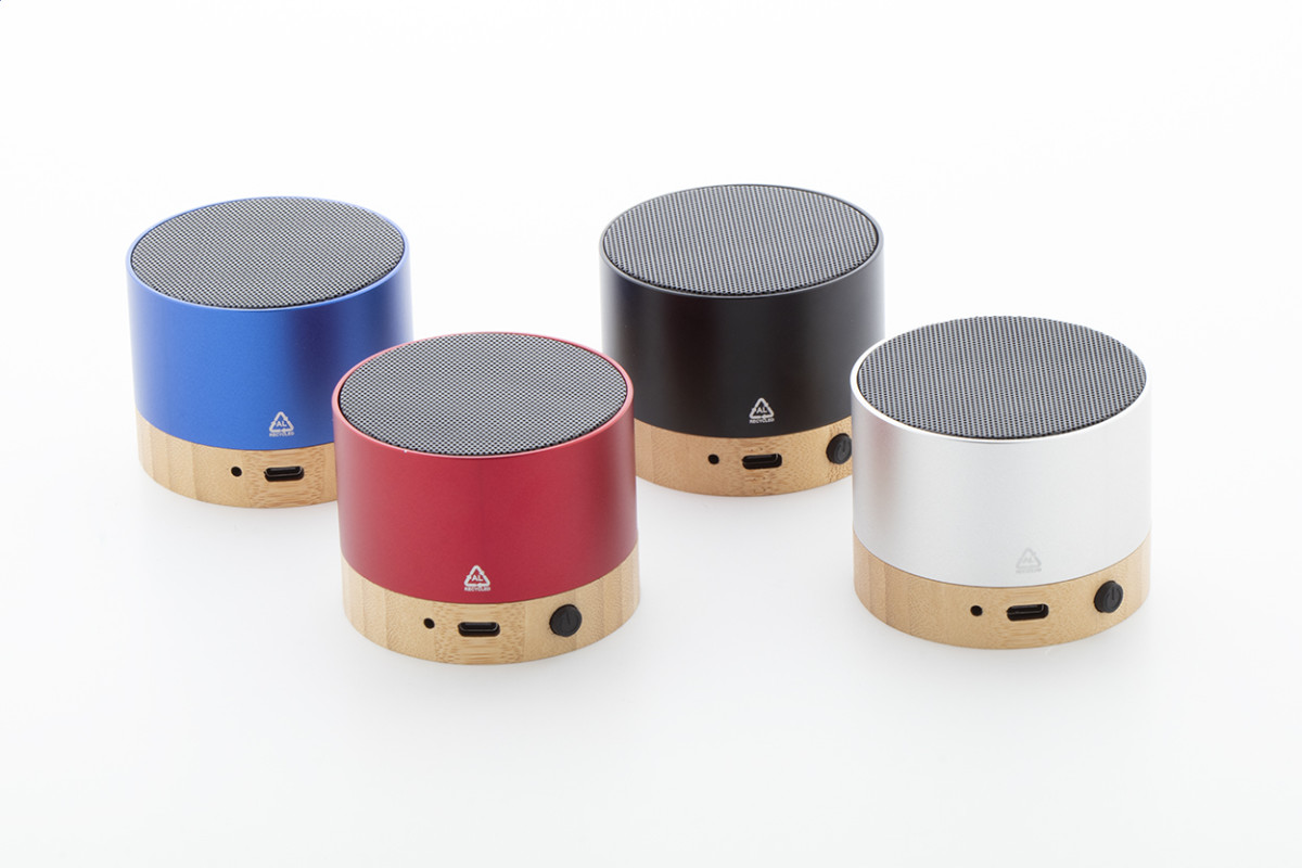 Újrahasznosított alumínium vezeték nélküli hangszóró bambusz alappal. Kihangosító funkcióval és beépített újratölthető akkumulátorral. USB töltőkábellel szállítjuk. Teteje