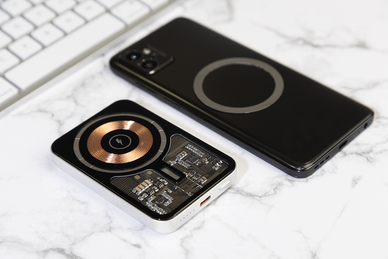 Újrahasznosított alumínium power bank félig átlátszó borítással és látható elektronikus alkatrészekkel. 5000 mAh-s akkumulátorral és beépített mágneses vezeték nélküli gyorstöltővel (15 W). USB-C bemenettel és töltőporttal. Öntapadó fémgyűrűvel, amellyel bármilyen vezeték nélkül tölthető eszközön használhatja a mágneses funkcióját. Kompatibilis az iPhone® 12 vagy újabb készülékekkel. USB töltőkábellel. Alja