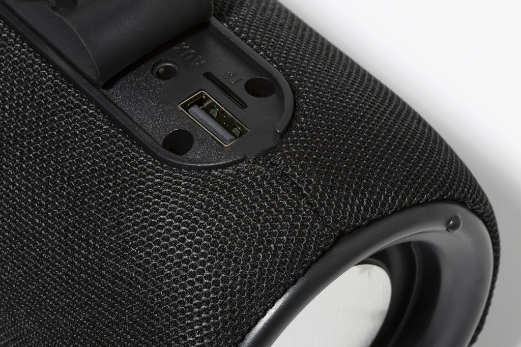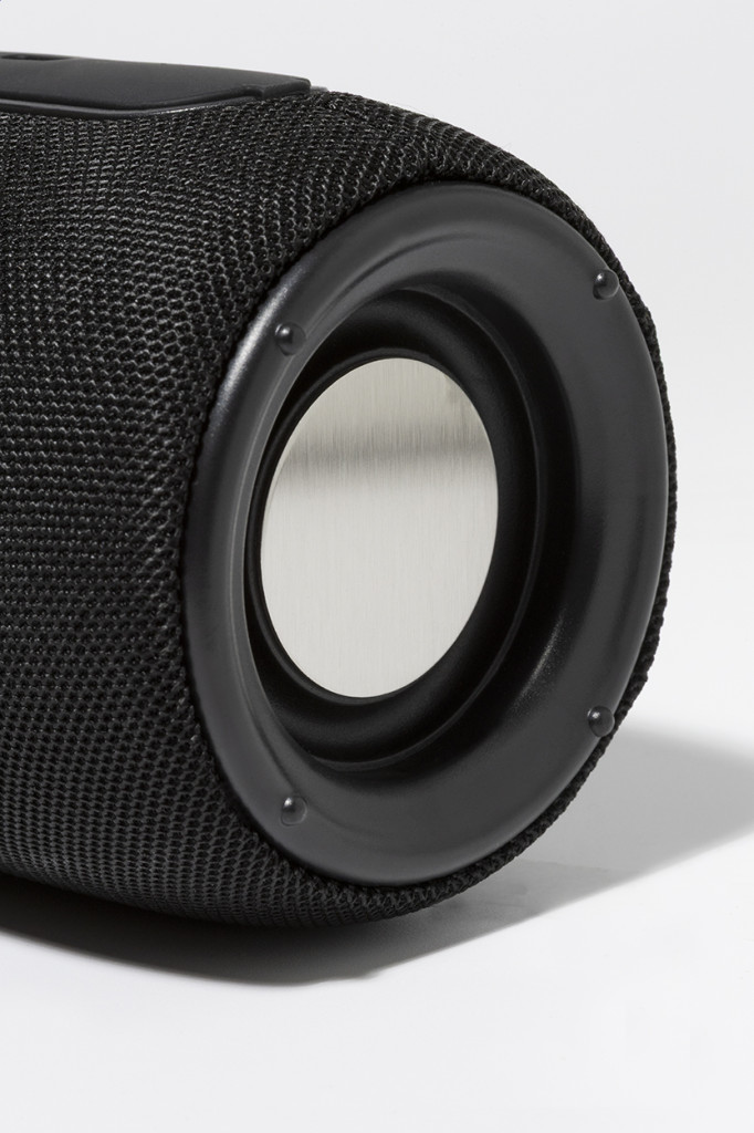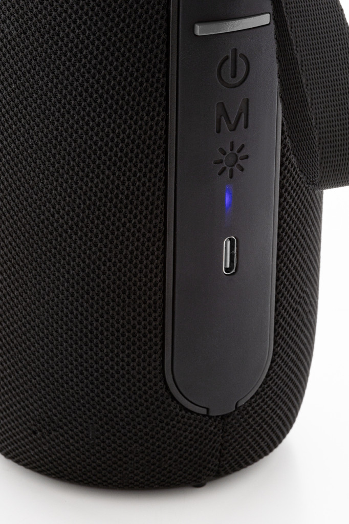 Poliészter szövet borítású vezeték nélküli hangszóró többszínű LED lámpával és hordszíjjal. 2 hangszóró meghajtóval, kihangosító funkcióval és beépített újratölthető akkumulátorral (1200 mAh). USB töltőkábellel. Teteje
