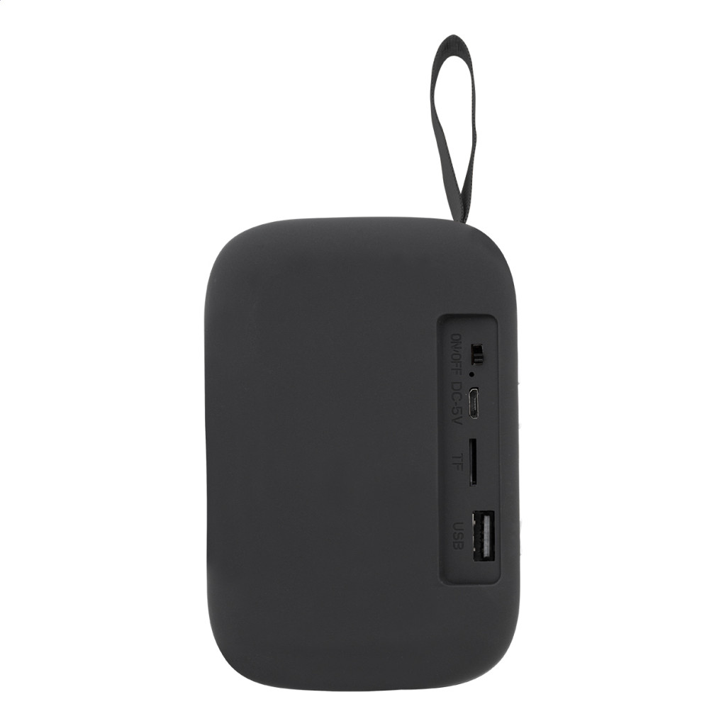 Vezeték nélküli hangszóró műanyag borítással, poliészterrel fedett hangszóróval és beépített újratölthető akkumulátorral (250 mAh). USB töltőkábellel. Hátulja