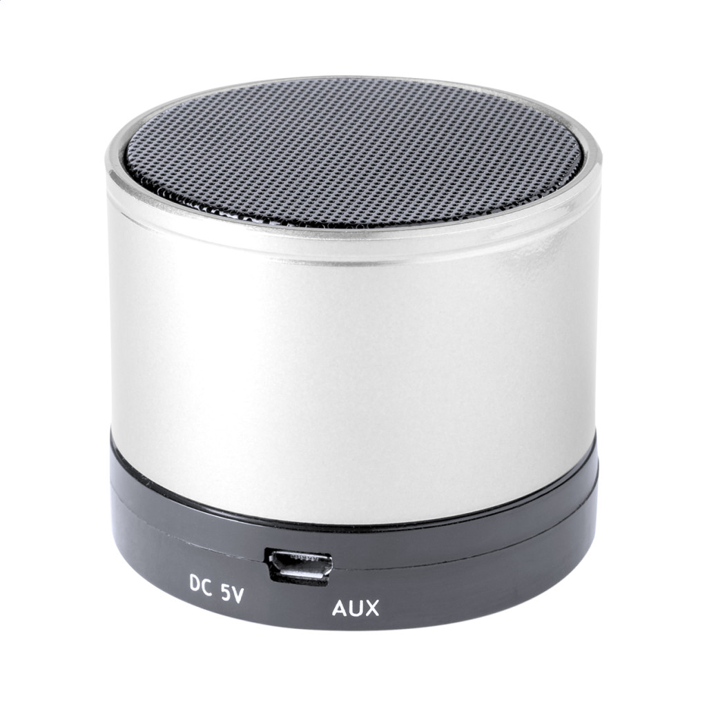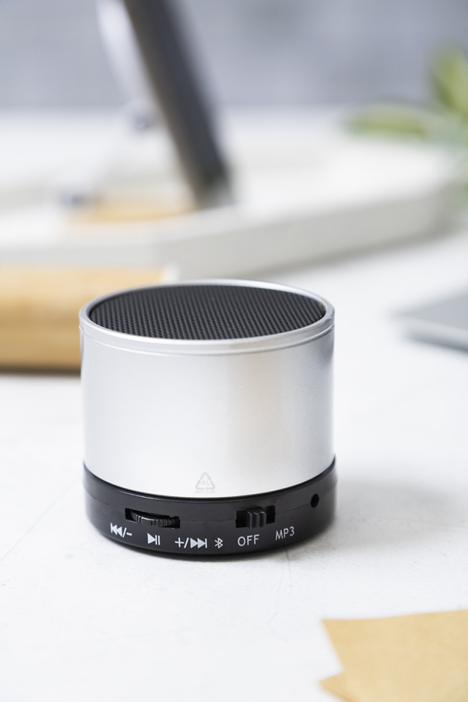 Vezeték nélküli hangszóró újrahasznosított alumínium borítással. Rádióval, MP3 lejátszóval, kihangosító funkcióval és beépített újratölthető akkumulátorral (300 mAh). USB töltővel és aux-in kábellel. Eleje