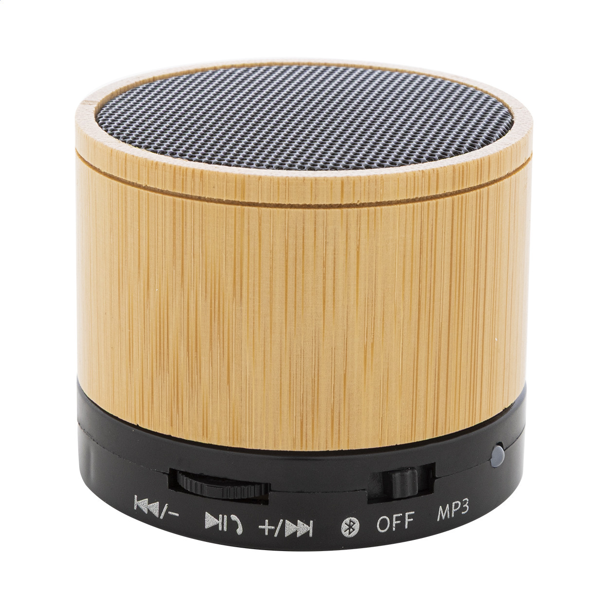 Vezeték nélküli hangszóró újrahasznosított ABS műanyag és bambusz házban, fém hálóval és újratölthető akkumulátorral (300 mAh). Kihangosító és micro SD MP3 lejátszási funkciókkal. USB töltőkábellel. Eleje