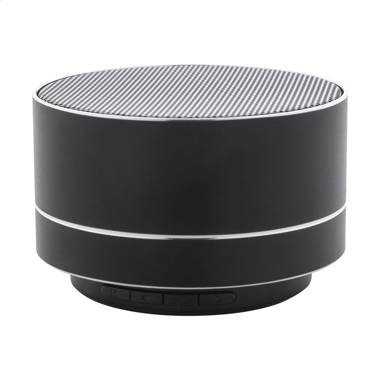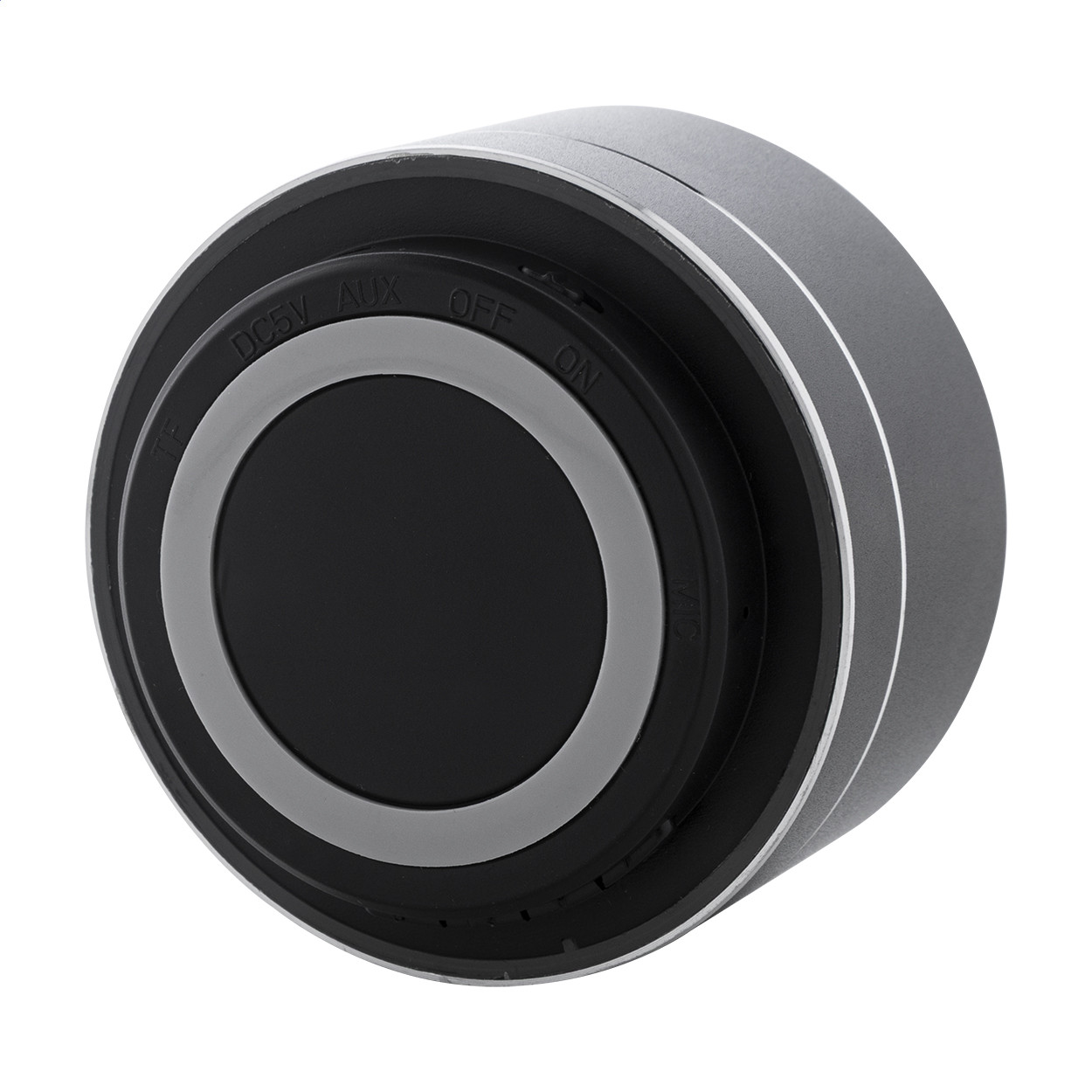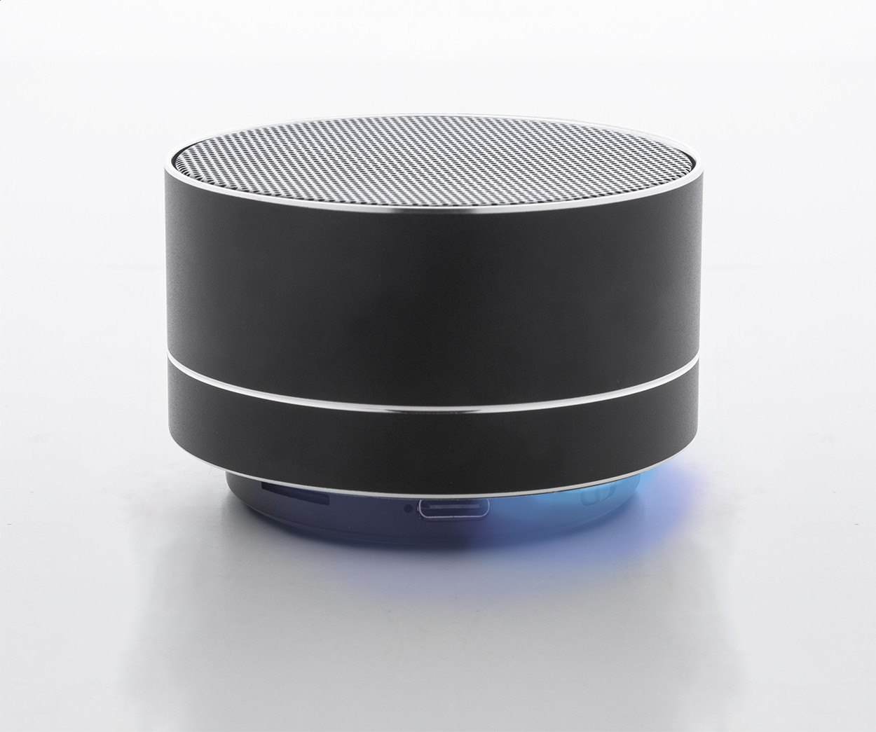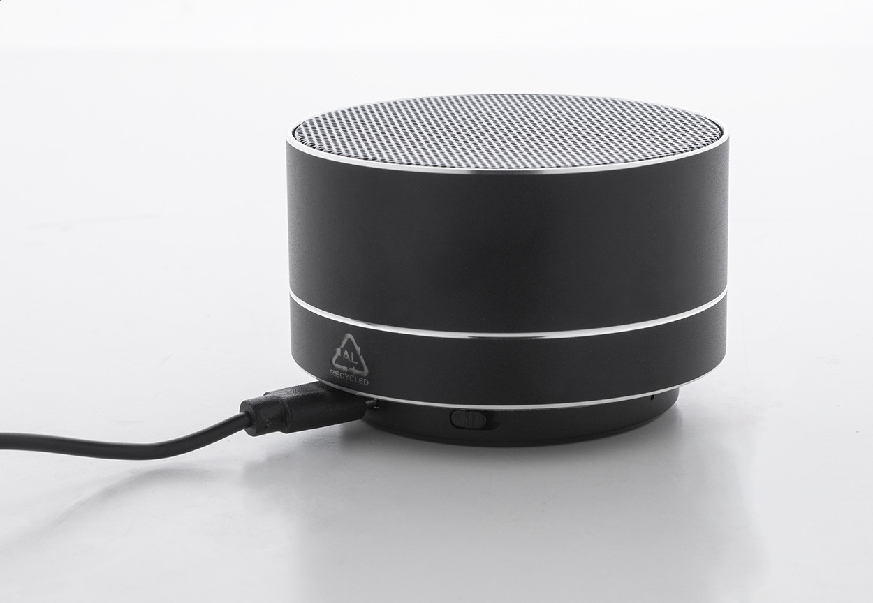 Újrahasznosított alumínium vezeték nélküli hangszóró fém hálóval, alján LED lámpával és újratölthető akkumulátorral (300 mAh). Kihangosító és micro SD MP3 lejátszási funkciókkal. USB töltőkábellel. Eleje