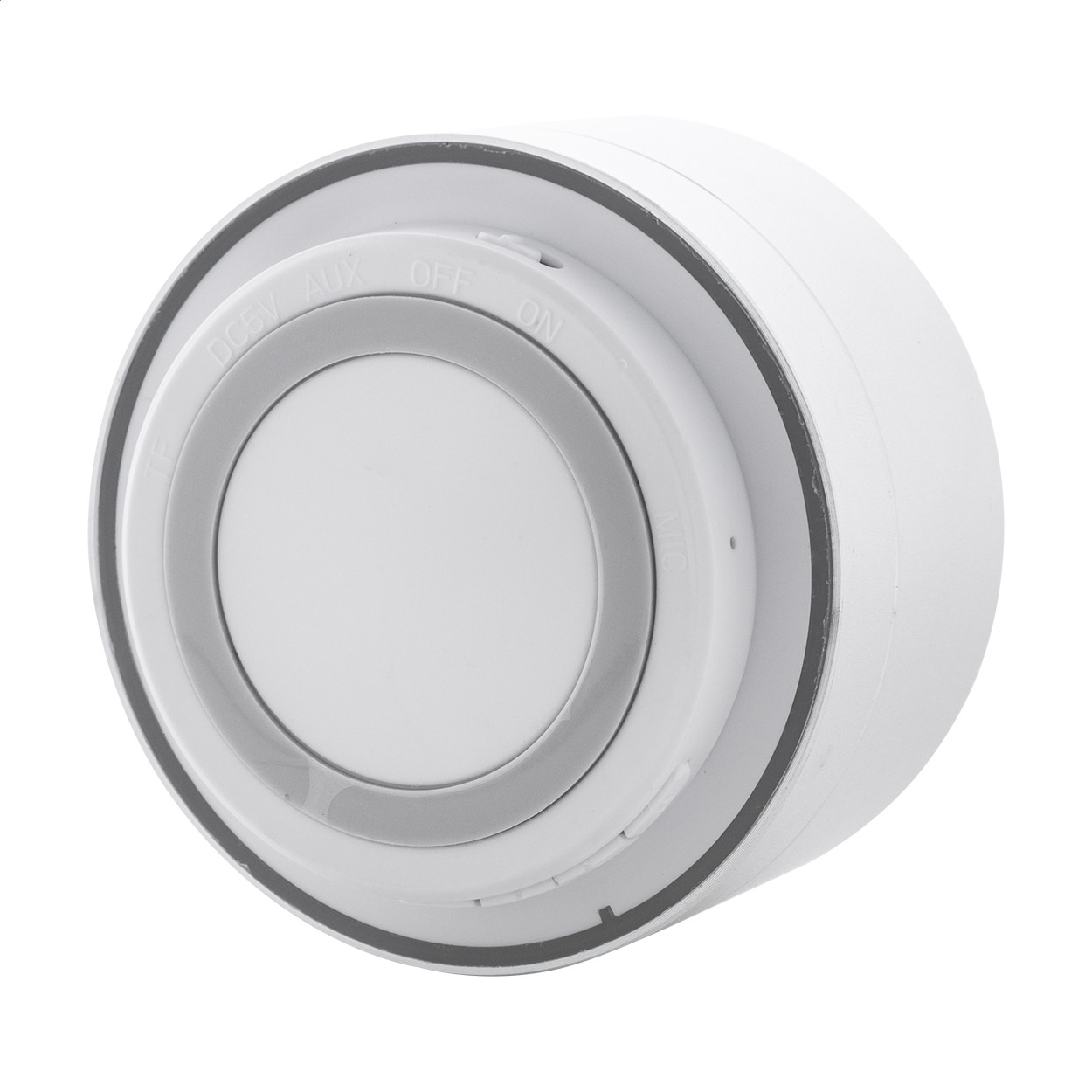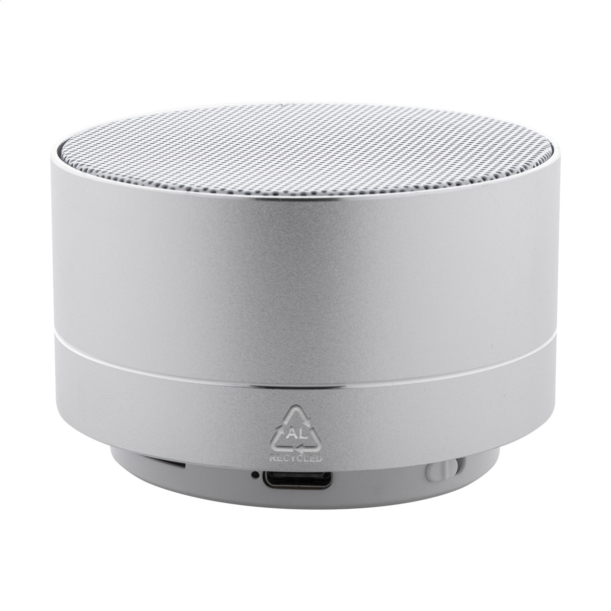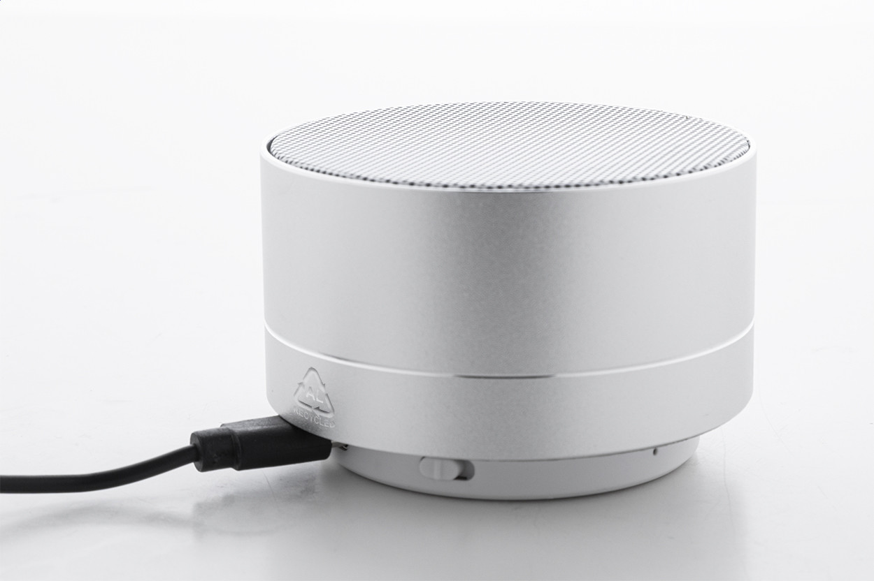 Újrahasznosított alumínium vezeték nélküli hangszóró fém hálóval, alján LED lámpával és újratölthető akkumulátorral (300 mAh). Kihangosító és micro SD MP3 lejátszási funkciókkal. USB töltőkábellel. Eleje
