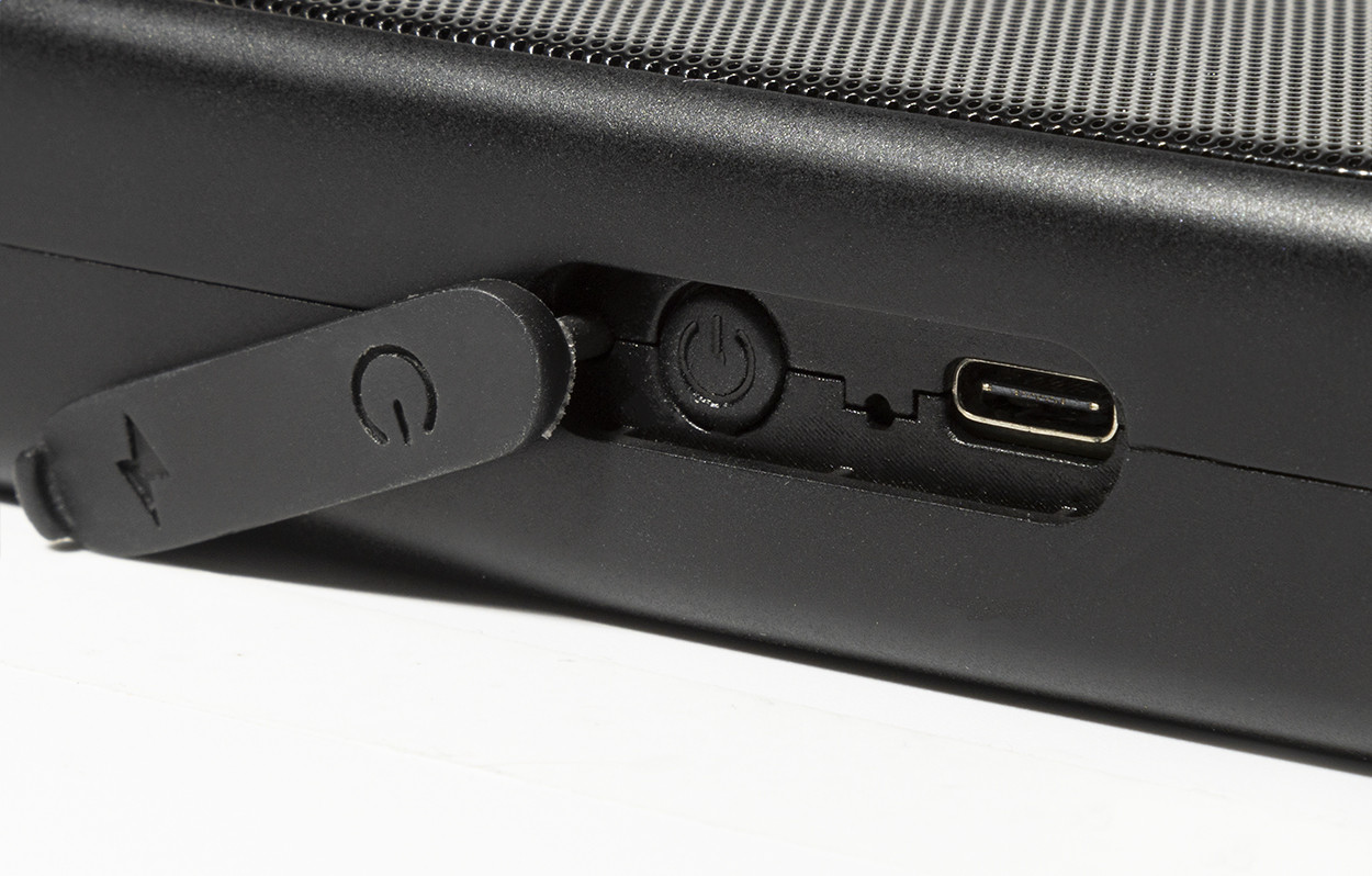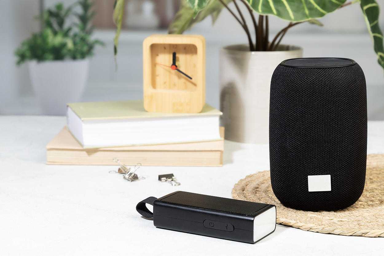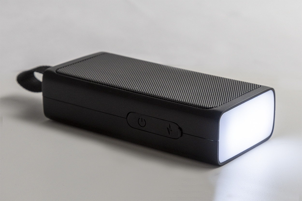 Újrahasznosított ABS vezeték nélküli hangszóró fém hálóval, LED zseblámpával és mágneses funkcióval. Beépített újratölthető akkumulátorral (500 mAh). USB töltőkábellel. Bal oldal