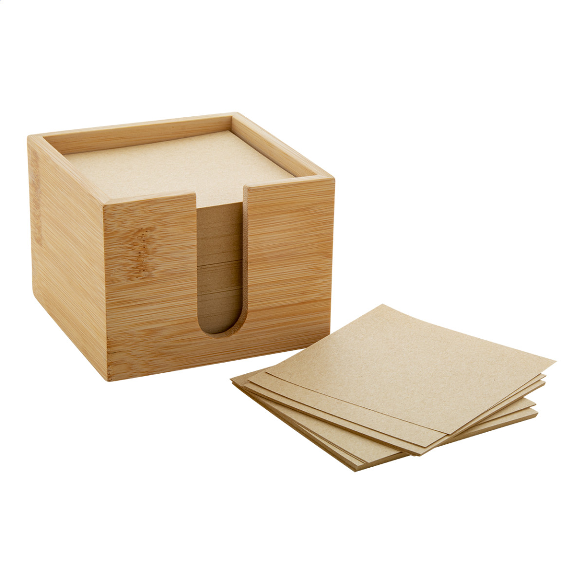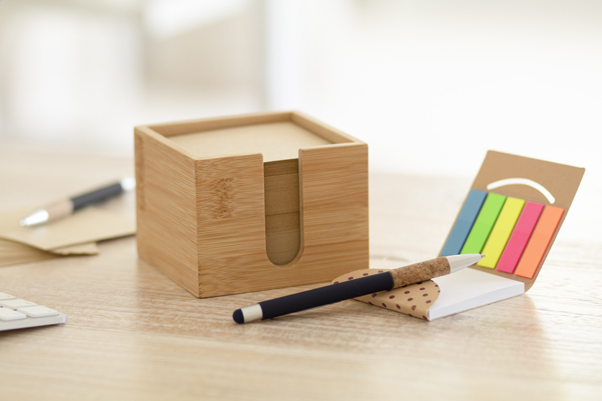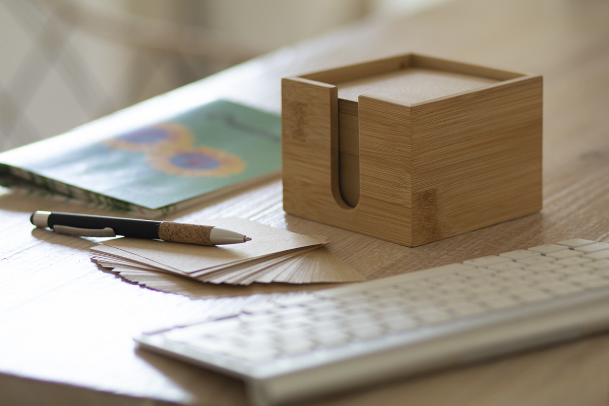 Bambusz jegyzettartó, 600 darab újrahasznosított papírból álló (80 g/m²) jegyzettömbbel. Eleje