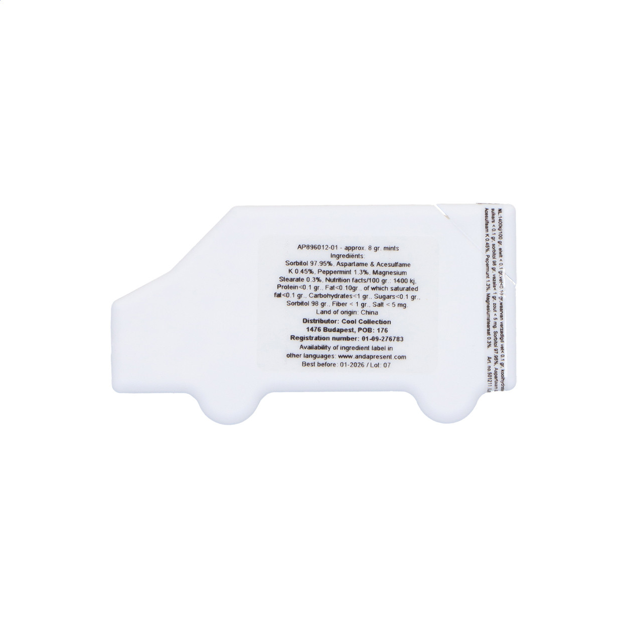 Teherautó alakú műanyag cukorka adagoló, kb. 8 gramm cukormentes mentolos cukorkával.
