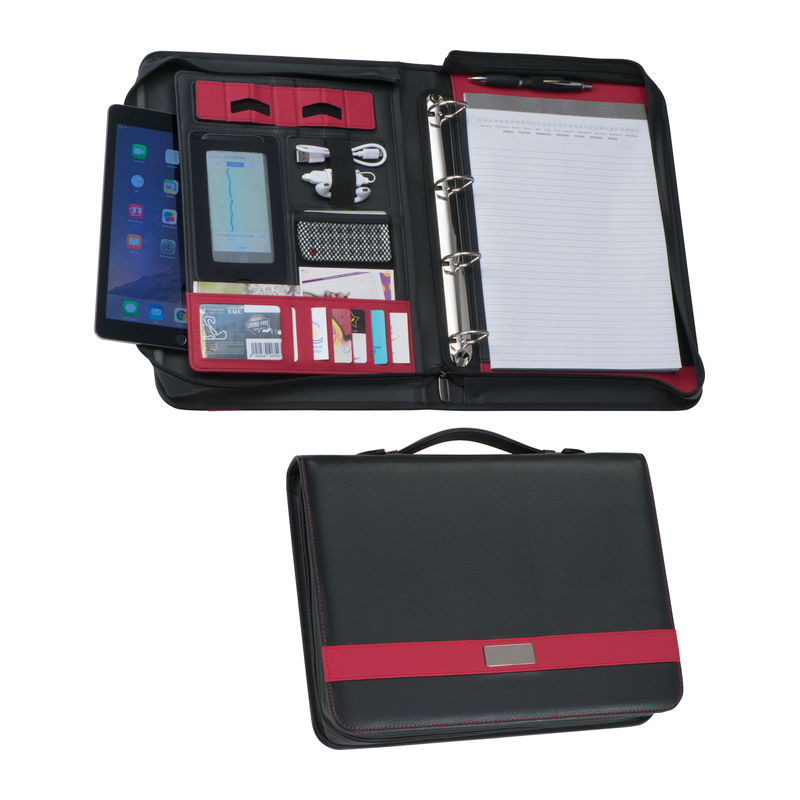 A4- es konferencia mappa tolltartóval, 4D-s gyűrűszerkezettel, 60 oldalas vonalas jegyzettömbbel, tablettartóval, mobiltartóval, elasztikus pánttal, 8 különálló rekesszel, egy nagy rekesszel, cipzárral és hordozó füllel ellátva.