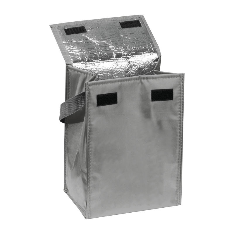 Poliészterből készült hűtőtáska belül szigetelő fóliával és tépőzáras záródással, kényelmes hordozófüllel.