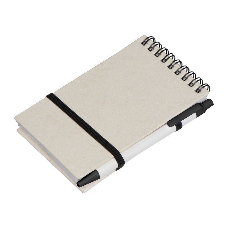 Újrahasznosított tejesdobozból készült spirál jegyzettömb, 140 db vonalas oldallal, gumis pánttal és kéken író golyóstollal.