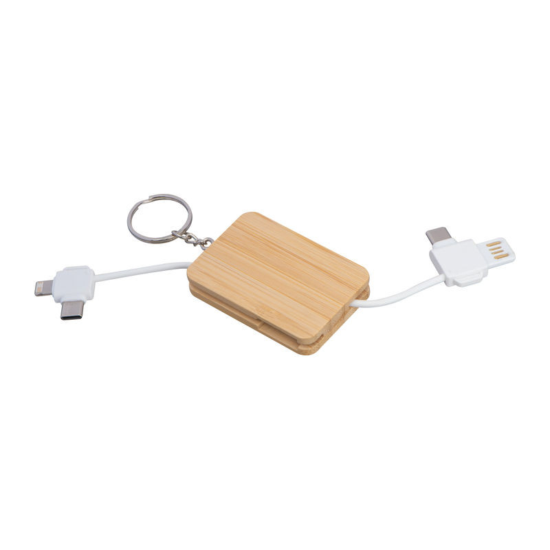 Praktikus bambusz kulcstartó töltőkábel funkcióval (USB-A/USB-C - USB-C/Lightning csatlakozók). Rendben tartja kábeleit és ideális utazáshoz.