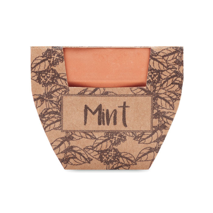 Kis terrakotta agyag cserép, menta magvakkal. Ültetőközeg koronggal szállítjuk. EU-ban gyártva.