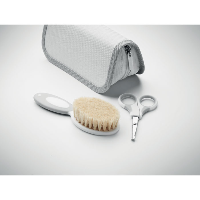 6 darabos babaápolási készlet. Tartalma: puha kefe, fésű, fogkefe, körömreszelő, körömvágó csipesz és olló. 600D poliészterből készült tárolótokban.