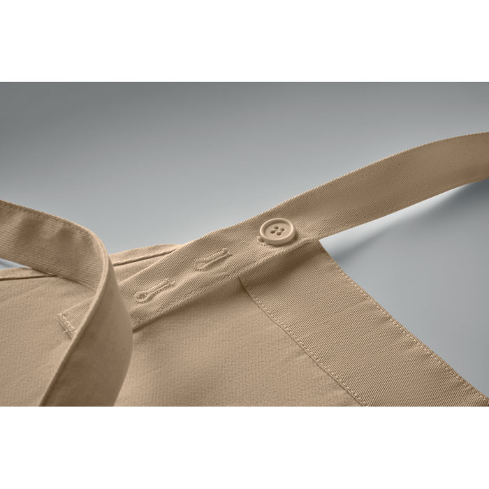 Állítható teljes kötény 1 nagy elülső, 2 rekeszre osztott zsebbel, 240 g/m² biopamutból. Gombbal állítható hosszúságú nyakpánttal.