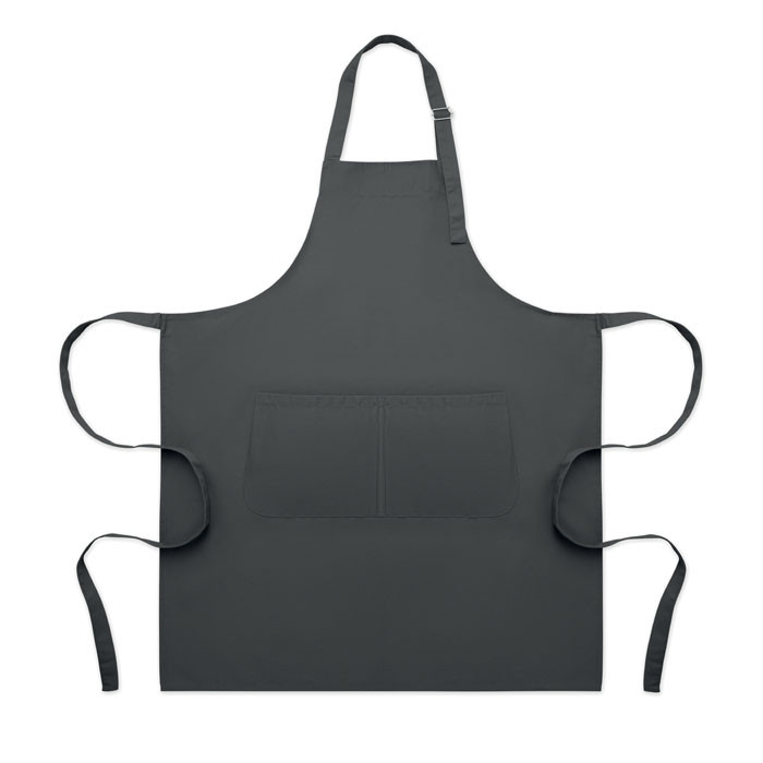 Hosszú, állítható konyhai kötény 240 g/m² poliészter-pamut anyagból (35% pamut, 65% poliészter), két elülső zsebbel és fémcsattal ellátott, állítható pánttal.