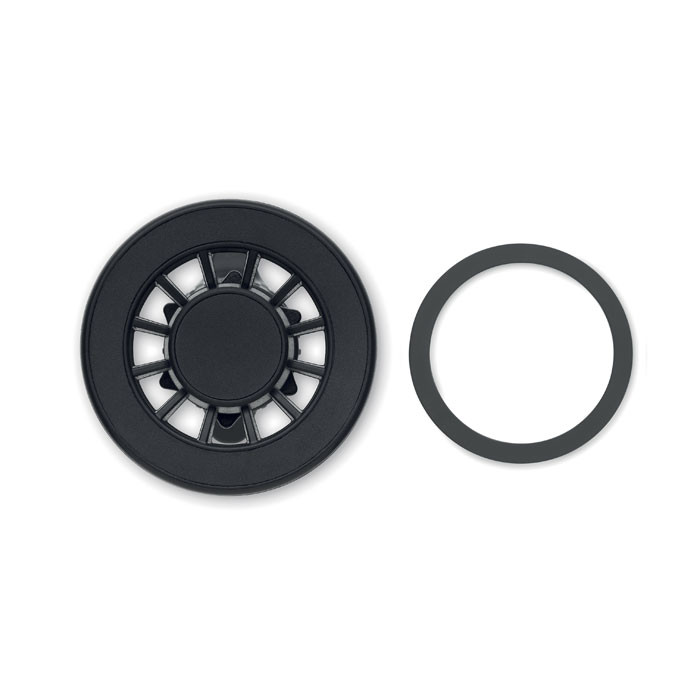 360 fokban forgatható, szellőzőnyílásra rögzíthető, mágneses telefontartó ABS-ből. További mágneses fémgyűrűt tartalmaz, amely támogatja más, nem mágneses, vezeték nélkül tölthető telefonok töltését.