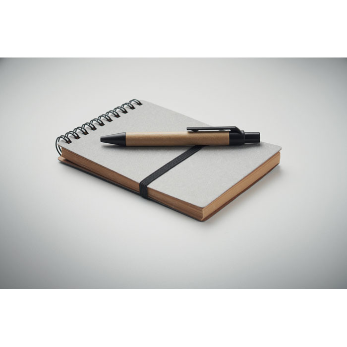 B7 újrahasznosított papír és PU borítós (70% újrahasznosított papír és 30% PU) jegyzetfüzet. Spirálozott. 140 vonalas, újrahasznosított papír oldal (70 lap). Színben illeszkedő nyomógombos golyóstoll, újrahasznosított papír tolltesttel, ABS szerelvényekkel. Kéken író betéttel. Elasztikus zárópánt és tolltartó hurok. FSC®-certified | FSC MIX CREDIT, P7.1, FSC-C213206