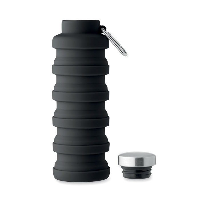 Összecsukható szilikon kulacs rozsdamentes acél fedéllel és alumínium karabinerrel. A karabiner hegymászásra, védőfelszerelés céljára nem alkalmas. Űrtartalom: 500 ml.