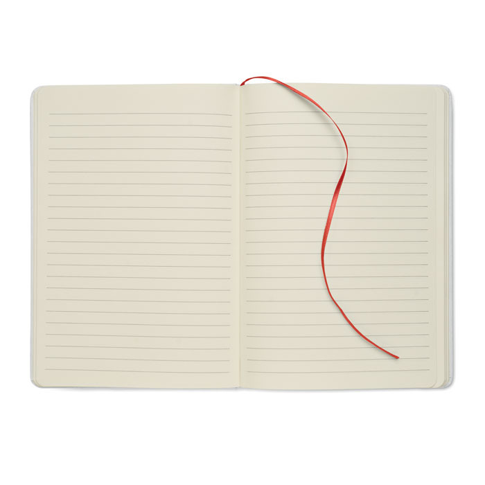 A5 keménytáblás jegyzetfüzet, 70%-ban újrahasznosított tejesdoboz csomagolásból és 30%-ban újrahasznosított papírból készült borítóval. Cérnafűzött. 160 vonalas oldal (80 lap) újrahasznosított papírból. Elasztikus zárópánt és könyvjelző szalag, melyek színe a gravírozás után, a fehér borító réteg alól megjelenő színhez illeszkedik.