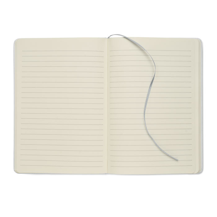 A5 keménytáblás jegyzetfüzet, 70%-ban újrahasznosított tejesdoboz csomagolásból és 30%-ban újrahasznosított papírból készült borítóval. Cérnafűzött. 160 vonalas oldal (80 lap) újrahasznosított papírból. Elasztikus zárópánt és könyvjelző szalag, melyek színe a gravírozás után, a fehér borító réteg alól megjelenő színhez illeszkedik.