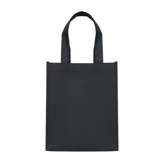 Kis ajándéktasak RPET nemszőttes anyagból, rövid fülekkel, toldással. 80 g/m².