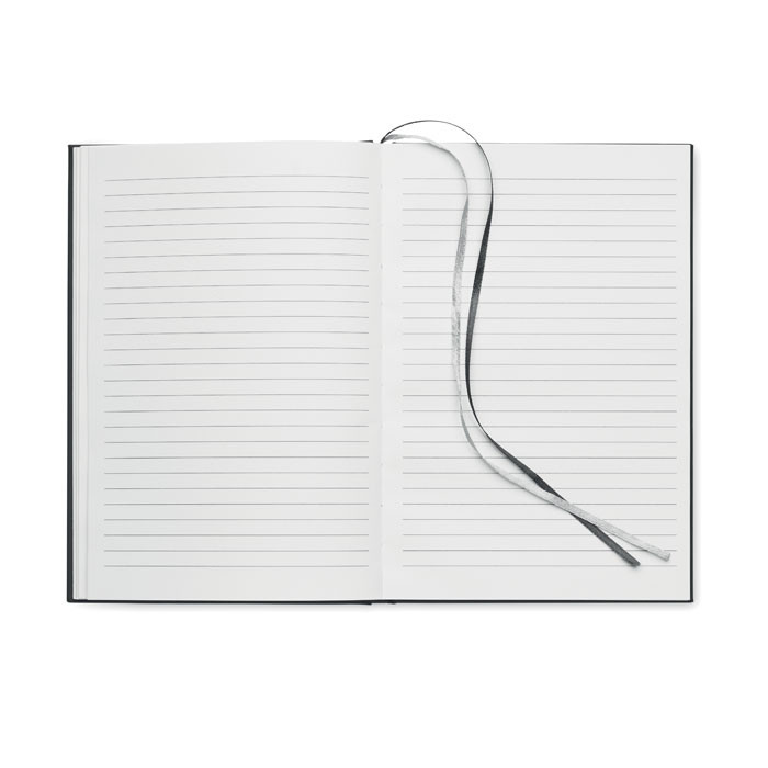 A5 jegyzetfüzet, 60% fogyasztás utáni újrahasznosított poliészter és 40% PU borítóval. Cérnafűzött. 256 vonalas oldal (128 lap) 70 g/m² újrahasznosított papírból. 2 poliészter könyvjelző szalaggal.