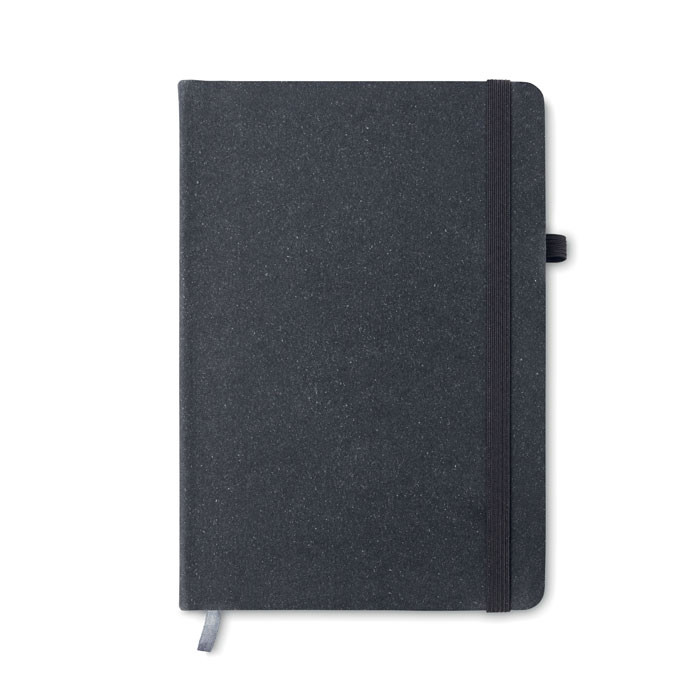 A5 jegyzetfüzet, 70%-ban fogyasztás előtti újrahasznosított bőrből és 30%-ban latexből készült PU borítóval. Cérnafűzött. 160 vonalas oldal újrahasznosított papírból (80 lap). Színben illeszkedő elasztikus zárópánt, tolltartó hurok és könyvjelző szalag.